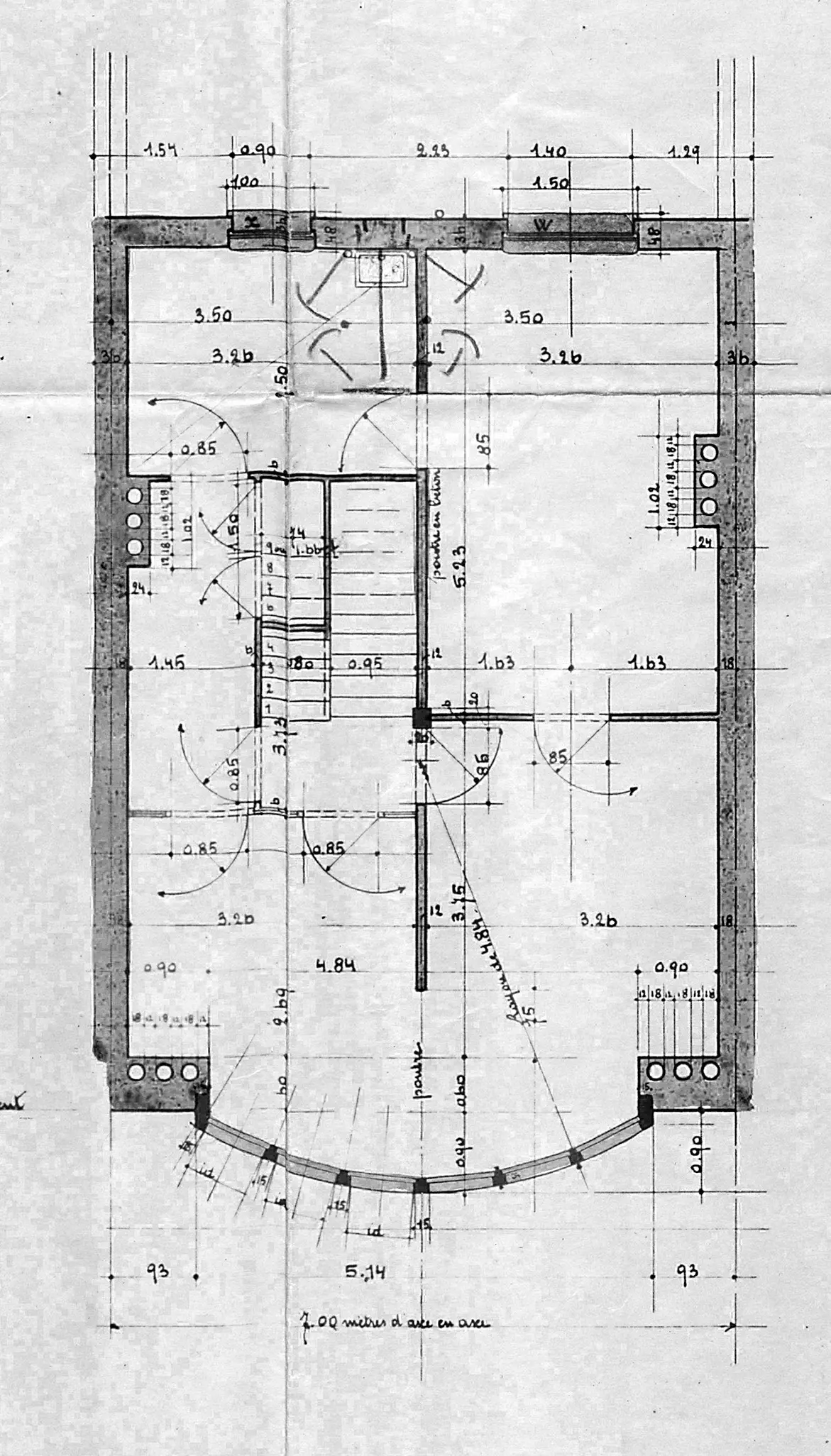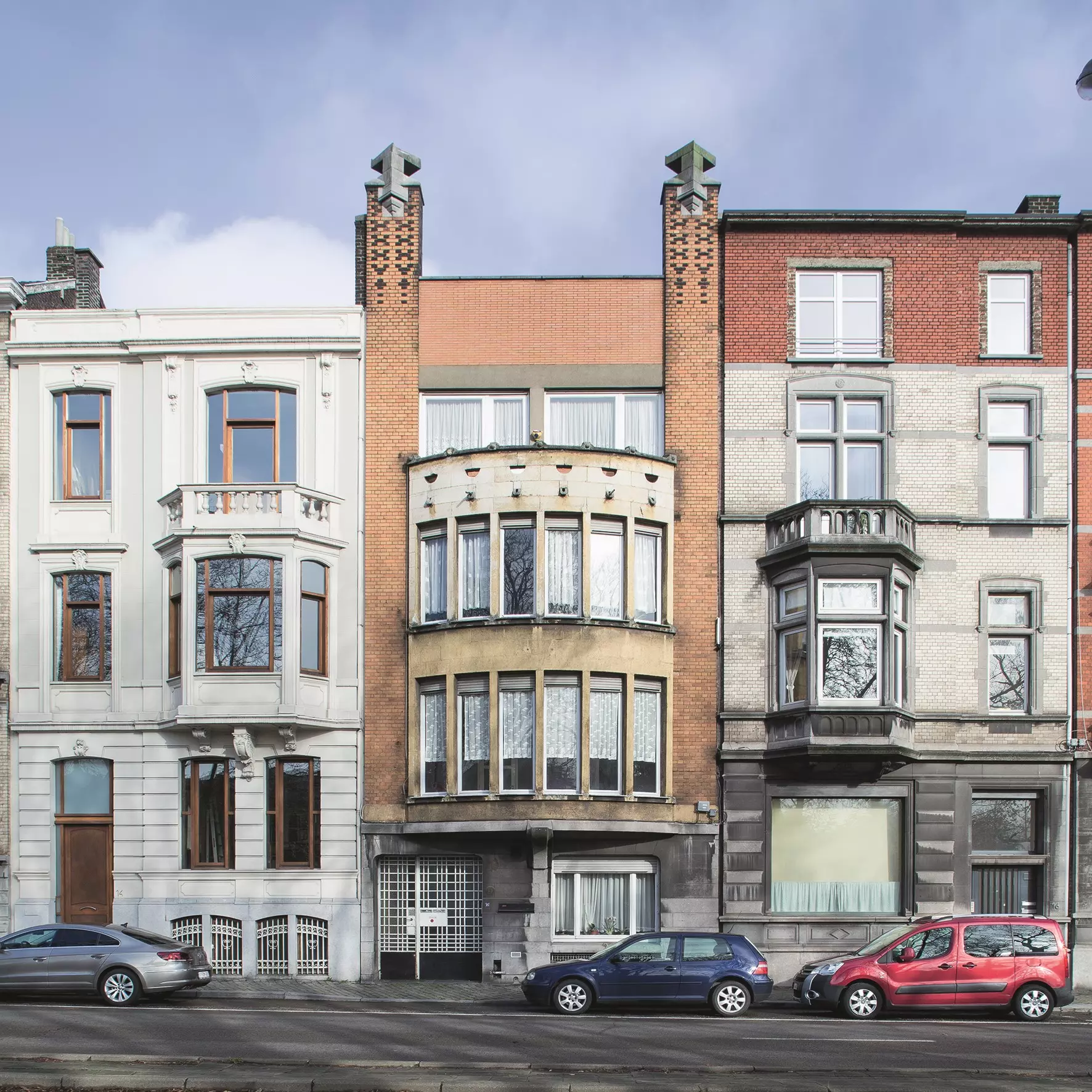 Au début des années 1910, l'architecte tire profit de l'expérience qu'il a accumulée chez Paul Jaspar dans la mise en œuvre du béton. Après l'avoir employé pour la structure de sa maison, il se lance dans une utilisation bien plus radicale pour cette maison d'agent de commerce : l'architecte propose un parement en béton pour l'ensemble du bow-window, déclenchant l'ire de l'éphémère Commission pour l'examen des façades qui voit d'un mauvais œil l'emploi d'un matériau industriel, a fortiori dans ce nouveau quartier bourgeois loti sur le site de l'Exposition universelle. Le jugement administratif est implacable : « La sécheresse des lignes, la nudité des surfaces et l'absence voulue de tout élément architectonique concourent à donner à l'ensemble un aspect à ce point rudimentaire qu'il ne lui est pas possible d'admettre que la façade présente le caractère architectural que la Ville est en droit d'exiger. » Pour défendre son projet, Pirnay sollicite et reçoit l'appui de Paul Comblen et Victor Horta, interpelle la revue d'architecture Tekhné, mais rien n'y fait : l'administration campe sur ses positions, le contraignant à utiliser de la pierre.