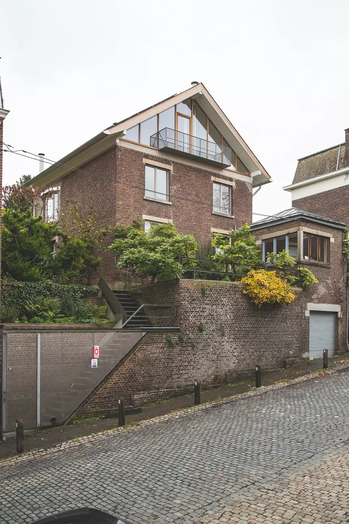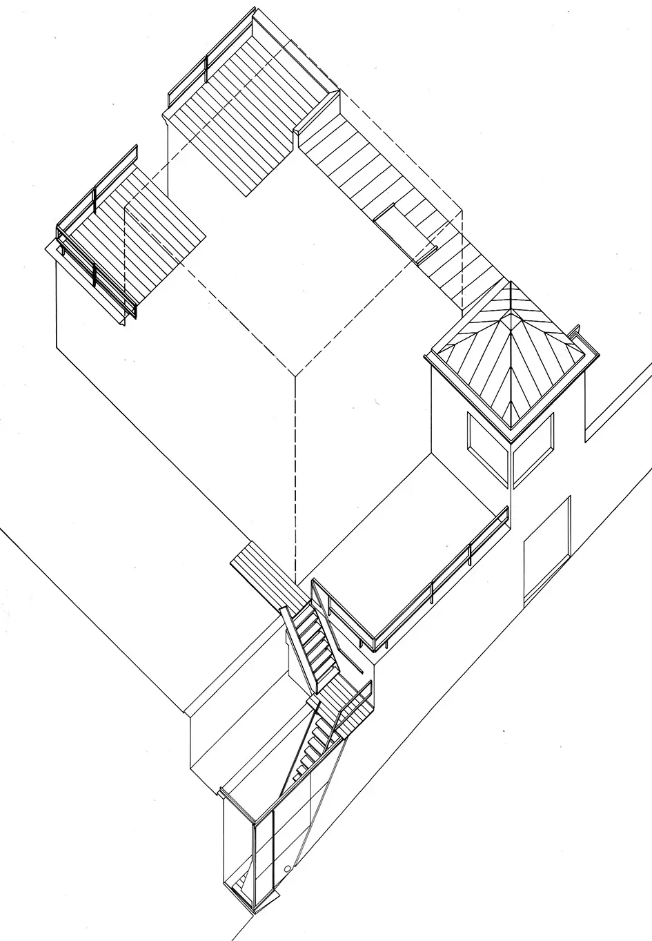 Une réflexion sur la cohabitation de ces deux sphères (privée/ publique) est menée par l'architecte, afin d'apporter réponse à la question : comment accueillir et guider le visiteur vers l'entrée haute, tout en préservant l'intimité des habitants ? Un système en acier, composé d'un écran ajouré, d'escaliers et de garde-corps s'emboîte sur l'ancien mur de soutènement, créant un jeu de pleins et de vides. Toute en transparence, la nouvelle clôture protège et délimite la propriété, complétée par le dispositif de couverture du petit volume surplombant la rue, par une toiture pyramidale en zinc.