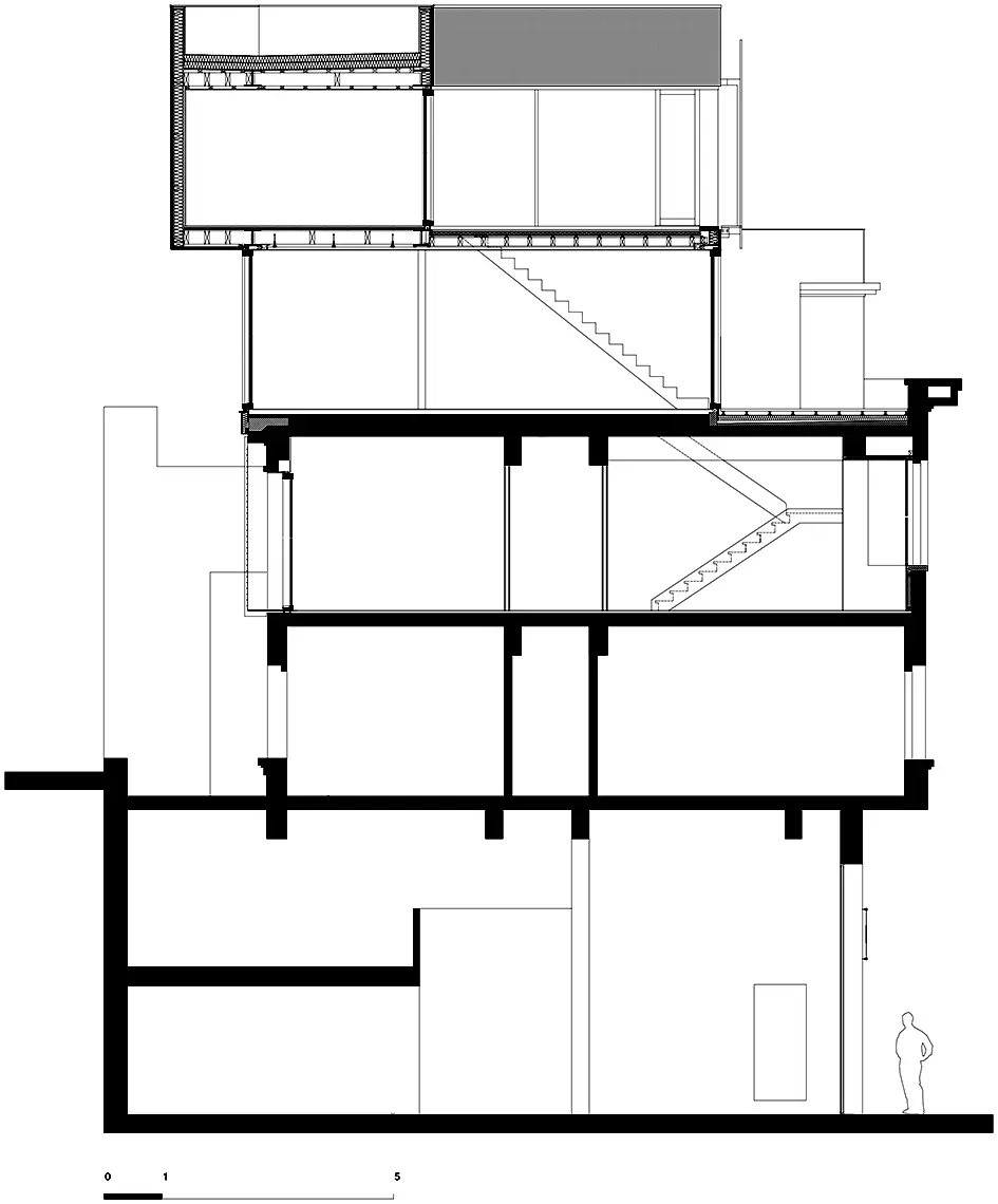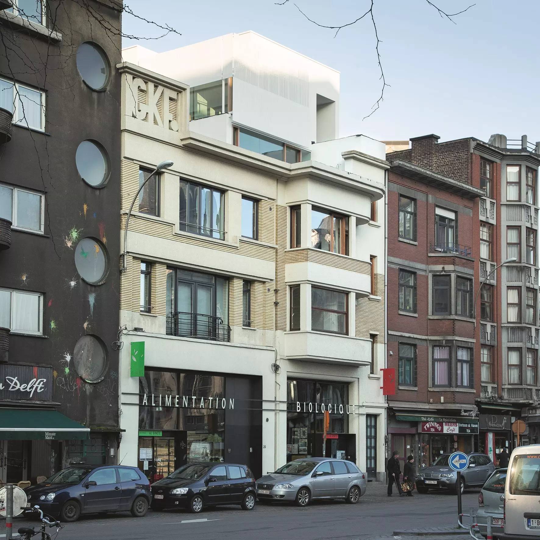En 2008, le propriétaire confie l'agrandissement de son commerce d'alimentation biologique (Al'binète) aux architectes, annexant le rez-de-chaussée voisin. Constatant que la toiture présente un potentiel intéressant, ceux-ci achètent les étages : ils y installent leurs bureaux et rehaussent le bâtiment (Joseph Bage, 1936), en construisant un duplex de 130 m² sur le toit plat. En structure mixte acier et bois, l'intervention s'inscrit dans le prolongement de la cage d'escalier originelle. En retrait du front bâti, elle dégage deux terrasses ; la plus exposée est protégée des regards par un claustra en aluminium blanc, dans la teinte de l'enduit.