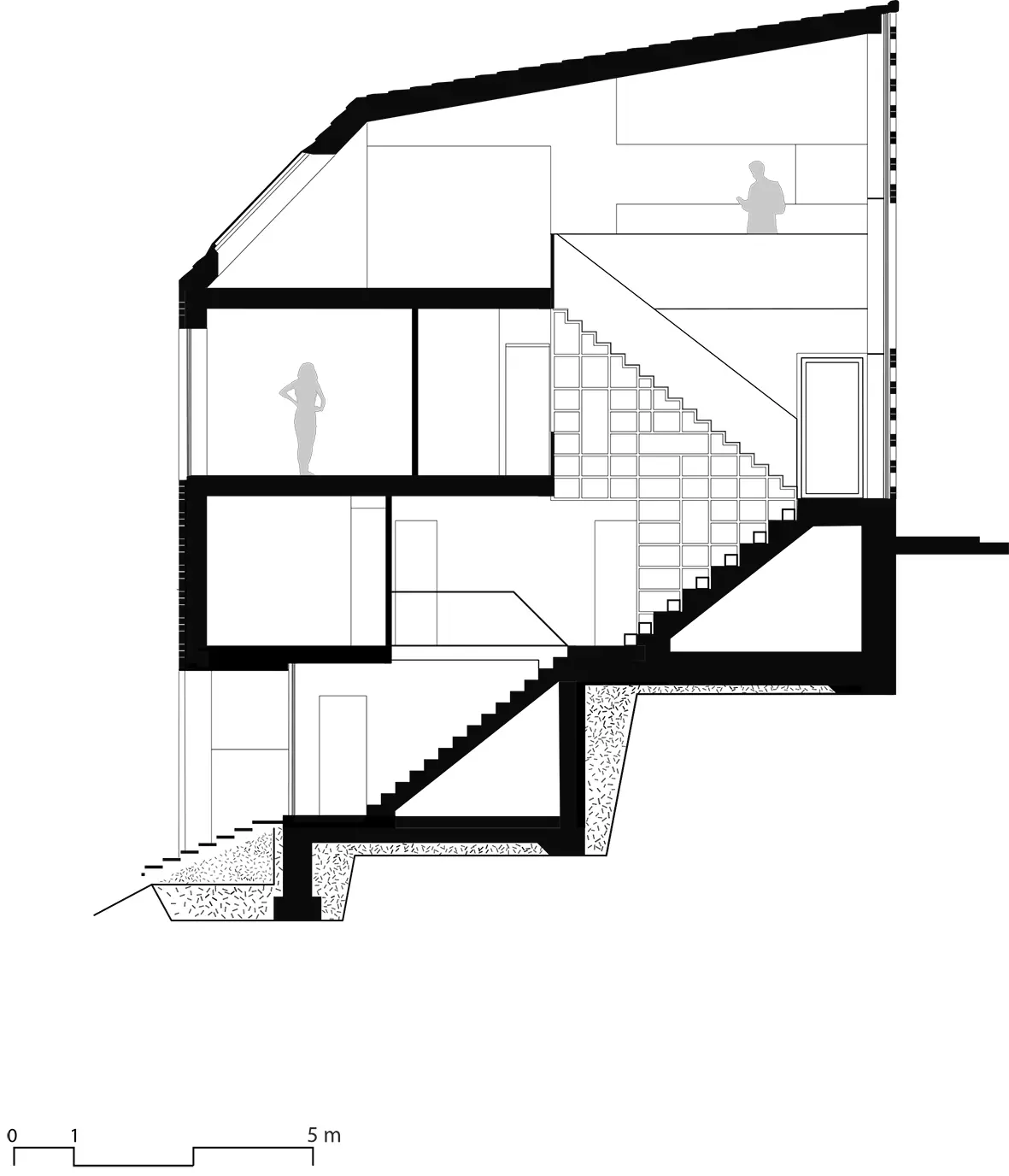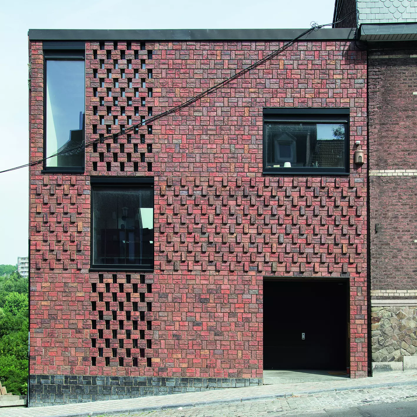 Répondant au standard basse énergie, la maison se pose sur un terrain très escarpé, le long d'une rue très fréquentée. Les jeunes architectes – dont il s'agit de la première réalisation urbaine – organisent l'habitation en tenant compte de la déclivité, inversant l'implantation habituelle des fonctions : l'espace de vie se situe au dernier niveau, à l'ensoleillement optimal, profitant d'une généreuse vue sur le parc de la Paix et les environs. Les chambres sont placées aux étages inférieurs. La lumière du sud est captée à rue par le bandeau vitré de la cage d'escalier, dont l'expression est visible en façade.