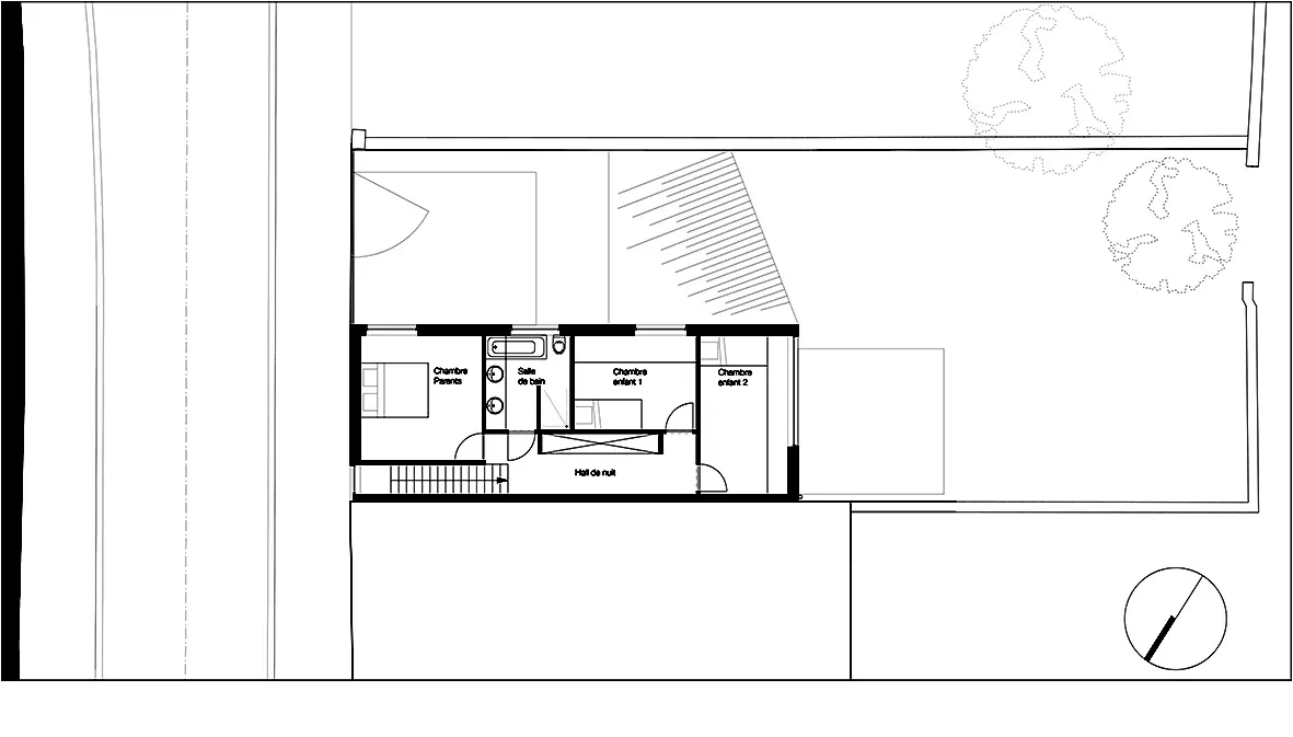 Sur ce terrain escarpé proche du centre et de la ligne de crête du Publémont, l'architecte conçoit une habitation sobre, parcimonieuse en espace et en énergie, pour un couple avec deux enfants. Le volume étroit et étiré épouse la courbe du site. Les espaces de vie s'installent à l'étage pour profiter du jardin en surplomb. Les façades sont percées d'ouvertures définies par les fonctions internes et cadrant le regard sur la ville.