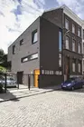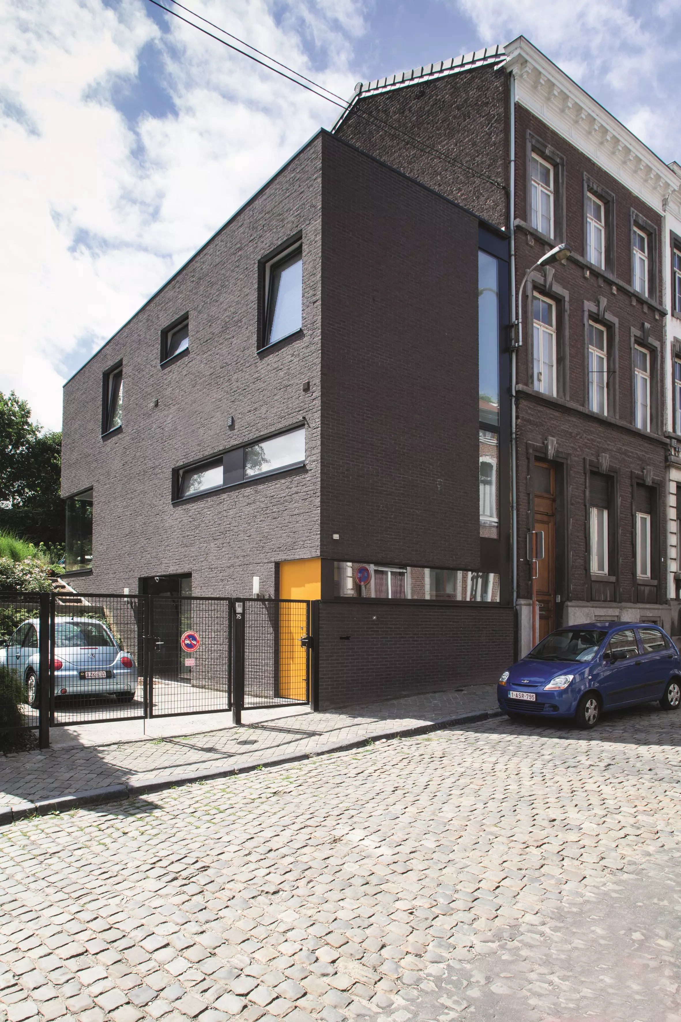 Au niveau des matériaux, dans l'optique de s'inscrire dans le contexte bâti, tout en marquant le caractère actuel de la construction, le choix s'est porté sur une brique foncée mate, dynamisée à rue par la porte d'entrée de l'habitation, d'un jaune orangé vif.