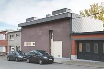 Vue depuis la rue, c'est une maison mitoyenne comme les autres, parfaitement intégrée à un environnement bâti des années 1950-1960.