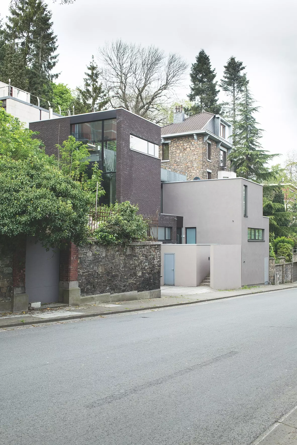 Implantée parallèlement à la rue, elle surplombe et englobe l'habitation initiale. La distribution des fonctions est inversée : les chambres se trouvent au rez, le premier est dédié au séjour, tandis que la cuisine s'épanouit dans les arbres, au second étage, en relation avec une terrasse aménagée sur le volume préexistant. Les ouvertures principales sont latérales et offrent des vues sur la végétation.