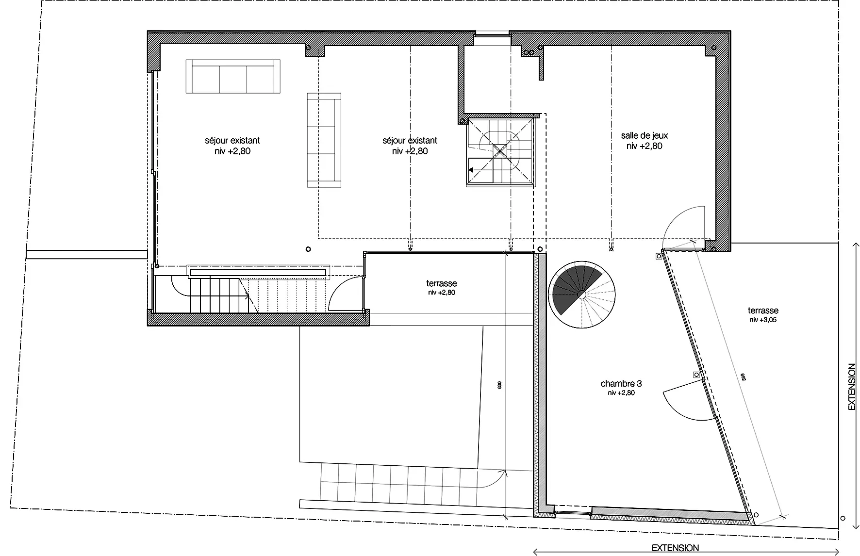Ses occupants y vivaient sur un seul niveau, comme dans un appartement. L'extension de briques foncées a permis de réorganiser les espaces de vie sur plusieurs étages et de modifier l'accès à la maison.