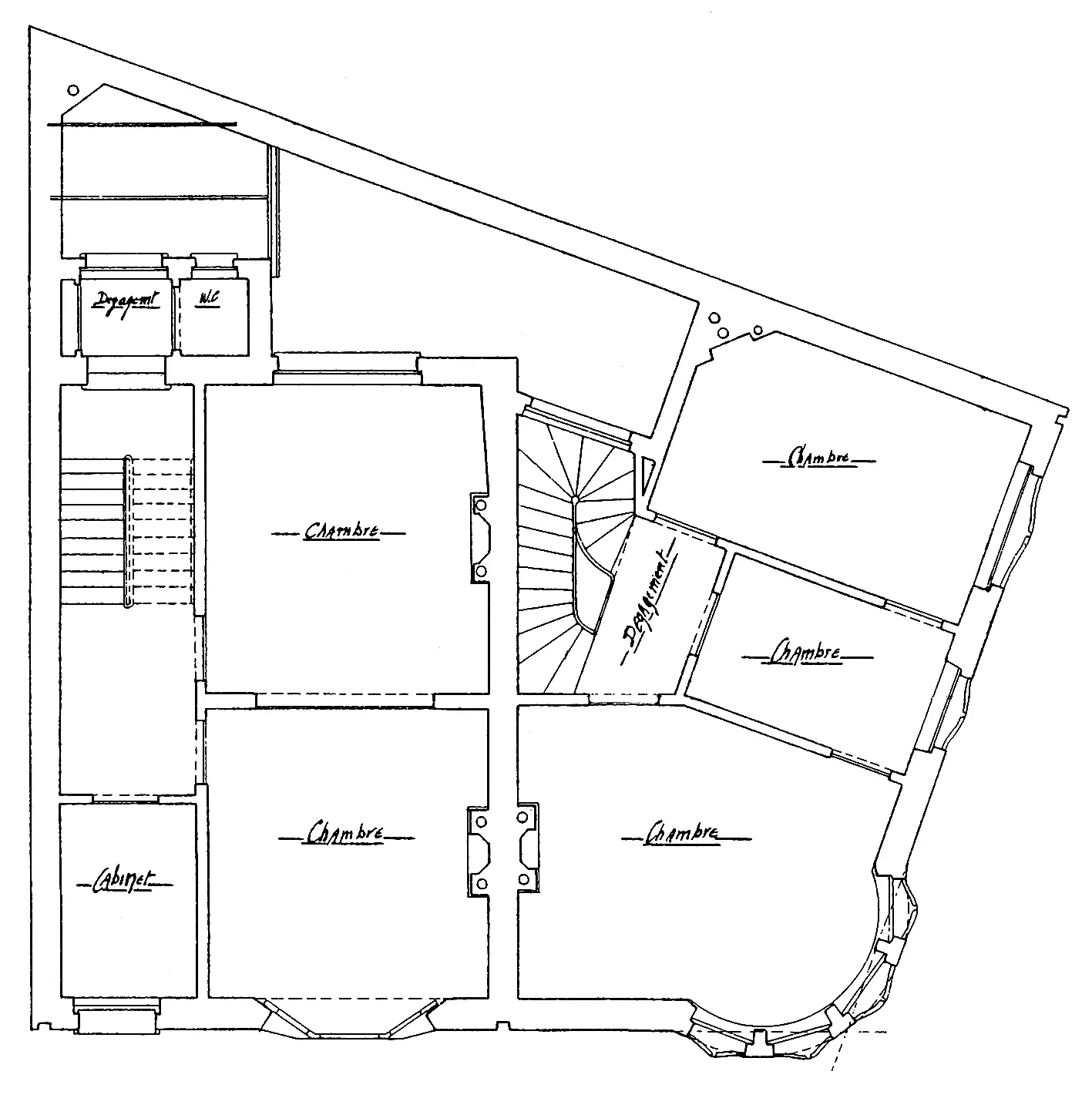 Les deux bâtisses de la rue du Parlement reprennent le même type de baies en obus tronqué que la maison d'angle, sauf pour le dernier étage, qui adopte des châssis circulaires, autre forme faisant partie du registre personnel de l'architecte. Construit pour abriter des habitations et un atelier de confiserie, le double bâtiment de la rue du Parlement comporte deux entrées et une élévation asymétrique. On retrouve les têtes sculptées aux consoles supportant l'oriel : ces têtes exotiques valent au bâtiment le nom de « maison des Aztèques ». Le décor sculpté est complété d'un hibou aux ailes déployées et de pilastres débordant au-delà de la corniche.