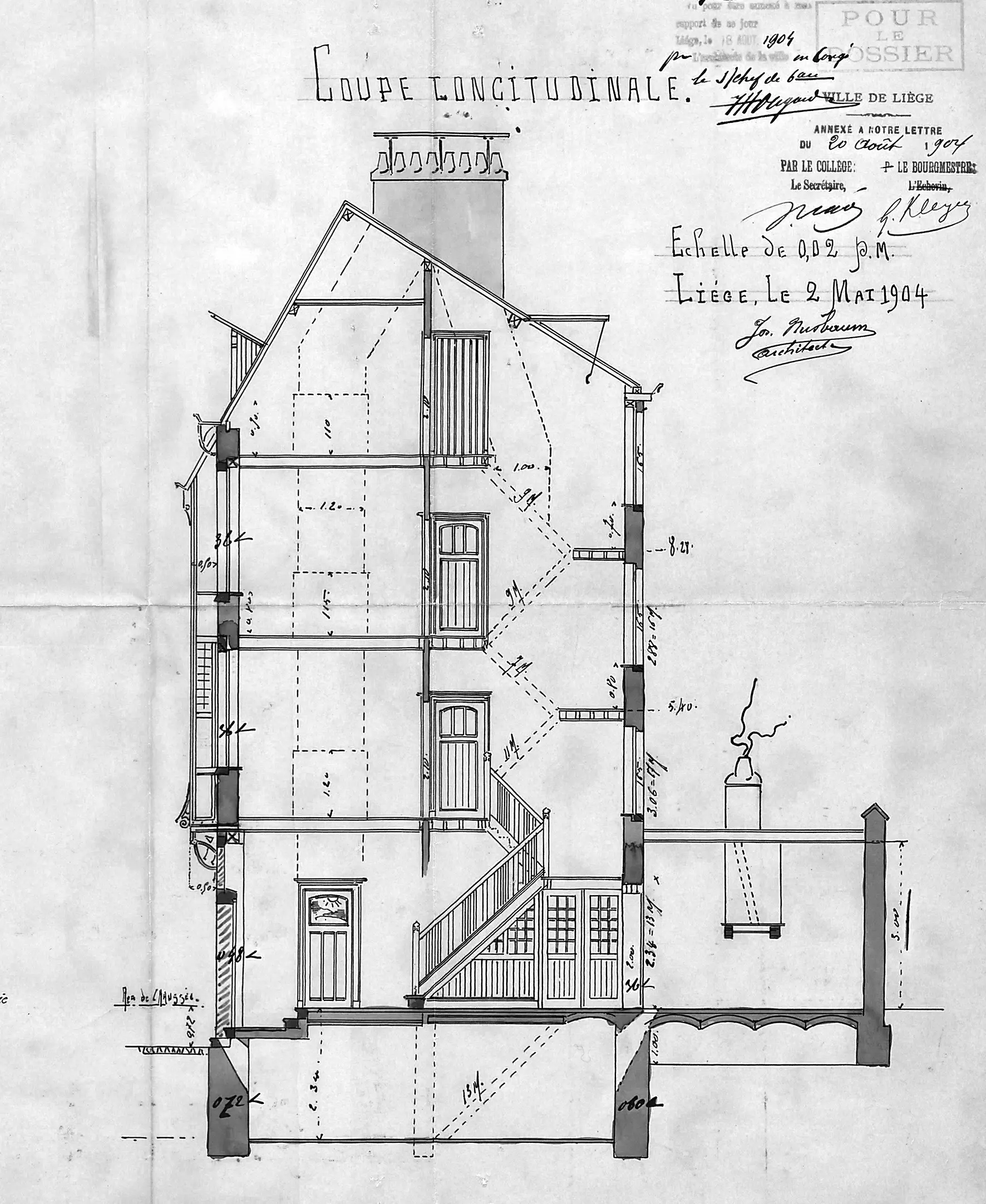 La conception architecturale s'écarte peu du schéma des habitations unifamiliales de l'époque (étage semi-enterré destiné aux services, 1er étage avec espaces de réception, deux étages de chambres). Se concentrant sur des groupes de maisons mitoyennes comme celles qu'il réalise rue du Vieux Mayeur, l'architecte réduit délais et coûts de construction, confère homogénéité à l'ensemble et rend le goût Art nouveau accessible à la petite bourgeoisie.