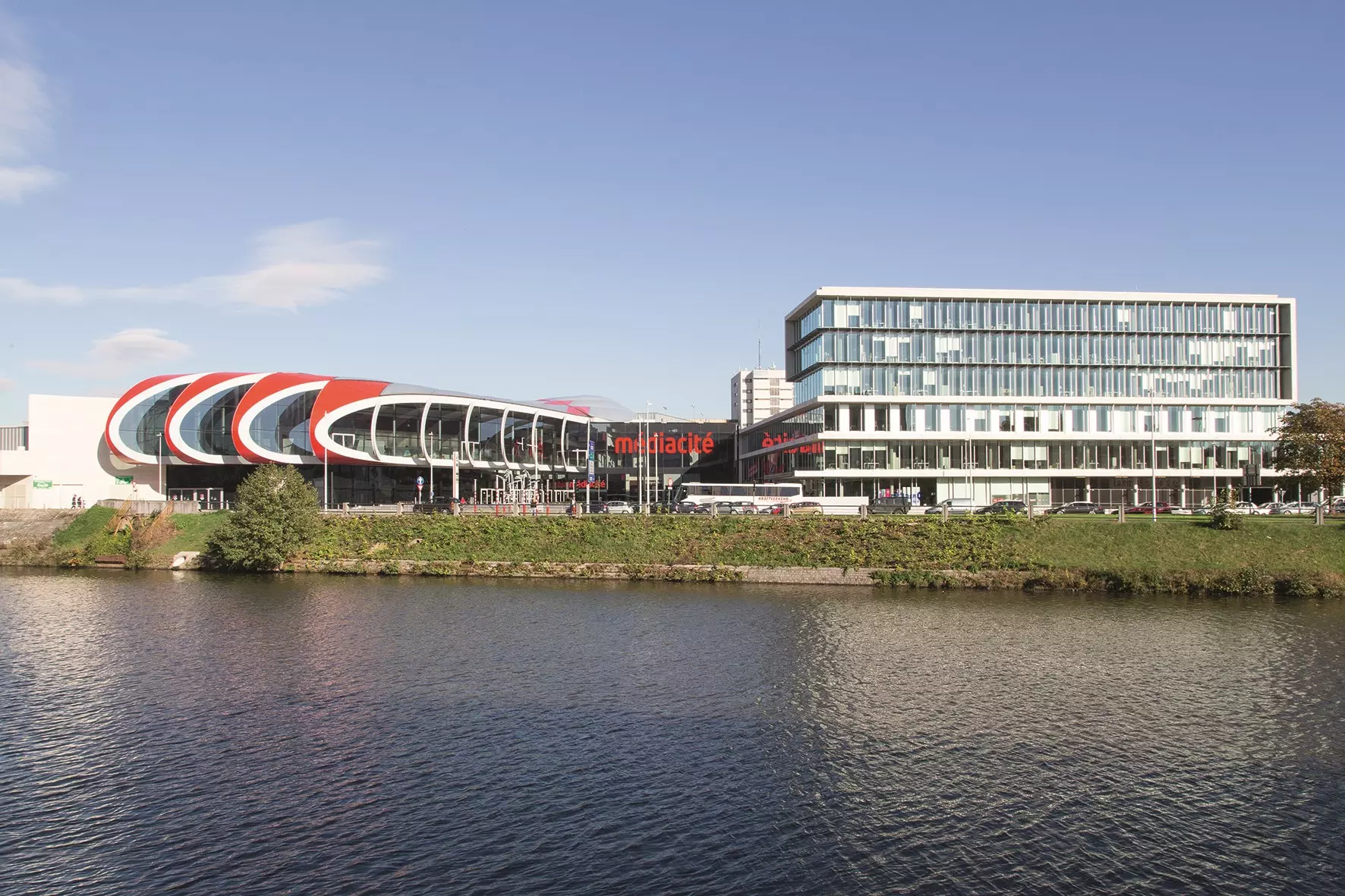 Les locaux du Palais des Congrès loués depuis 1961 étant devenus obsolètes depuis la révolution numérique, la RTBF rejoint la Médiacité pour y installer le site de production de Liège (220 personnes). Contrairement à l'architecture dynamique de la galerie commerciale, le bâtiment, construit selon les principes de sobriété et de transparence, se veut plus pérenne, afin de correspondre à l'image d'un service public et de ne pas rivaliser avec la galerie intensément colorée. Performant du point de vue environnemental (géothermie, cogénération, récupération eau de pluie), Média Rives rassemble des bureaux ainsi que deux studios d'enregistrement : un petit de 400 m² et le studio 40 (1 200 m², 35 x 35 m), qui peut accueillir, grâce à ses gradins modulables, jusqu'à cinq cents spectateurs, soit le plus grand en Fédération Wallonie-Bruxelles.