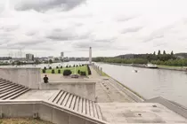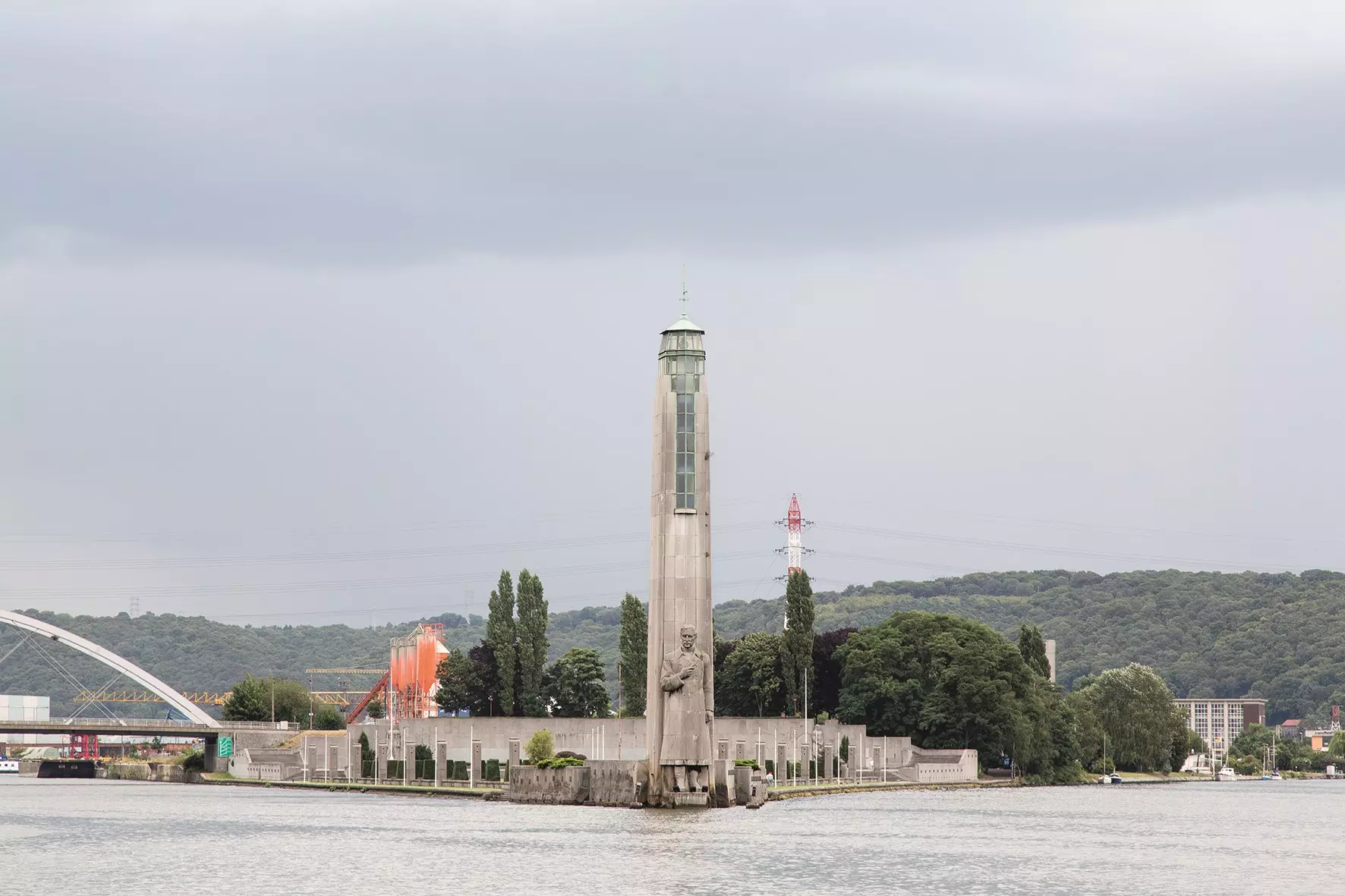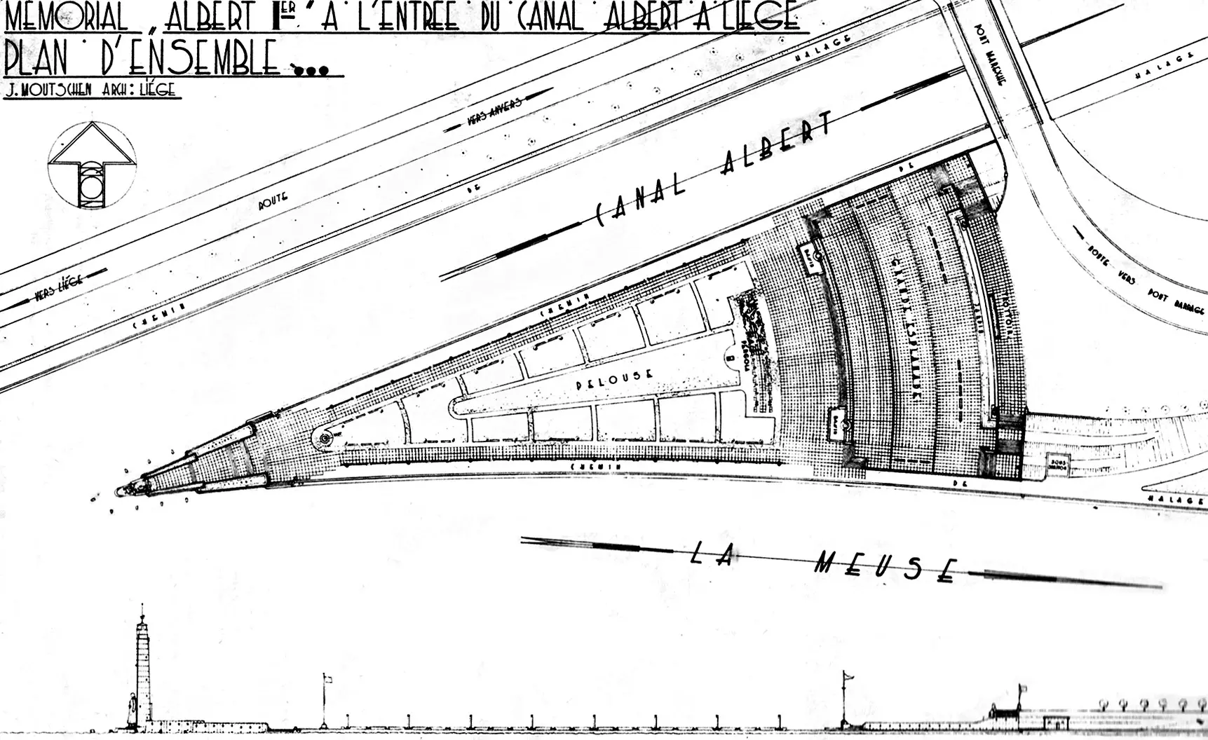 En provenance des carrières de Liège et du Hainaut, le petit granit y est abondamment présent – il s'agit de l'une des plus importantes utilisations de ce matériau (1 500 m3), posé ici sur coffrage en béton armé –, idéal pour sa résistance à l'atmosphère polluée du bassin industriel. Sur une fondation de quatre cent trente-cinq pieux Franki, Joseph Moutschen réalise un ensemble tout en sobriété, voire en solennité : l'espace est dégagé face à un plan d'eau large de 220 m sur 2 km de long, les cheminements sont lisibles, le plan triangulaire est adouci par des côtés aux courbes douces, affleurant à l'eau.