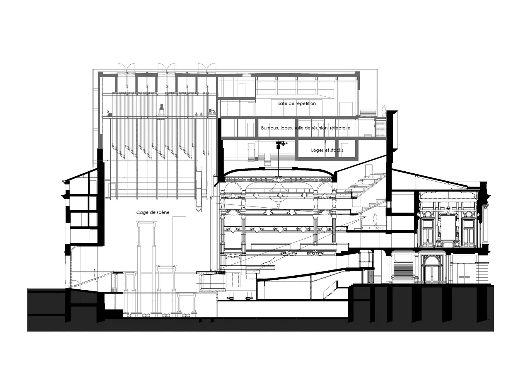 Entre 2010 et 2012, toutes les parties historiques classées sont restaurées ou recréées à l'identique par des artisans. Une association momentanée d'architectes se charge de l'agrandissement et de la modernisation : la philosophie adoptée dans la restauration – un retour aux qualités néoclassiques épurées du théâtre d'origine – est accompagnée par la conception d'une extension en toiture. Les architectes créent un volume parallélépipédique dont la hauteur est dictée par celle de la cage de scène ; il est enveloppé d'une double peau métallique ajourée créant des effets d'ombre et de lumière et offre à l'Opéra de nouveaux volumes (salle de répétition, bureaux, etc.). La cage de scène rehaussée accueille maintenant un gril technique reconnu parmi les plus modernes au monde.
