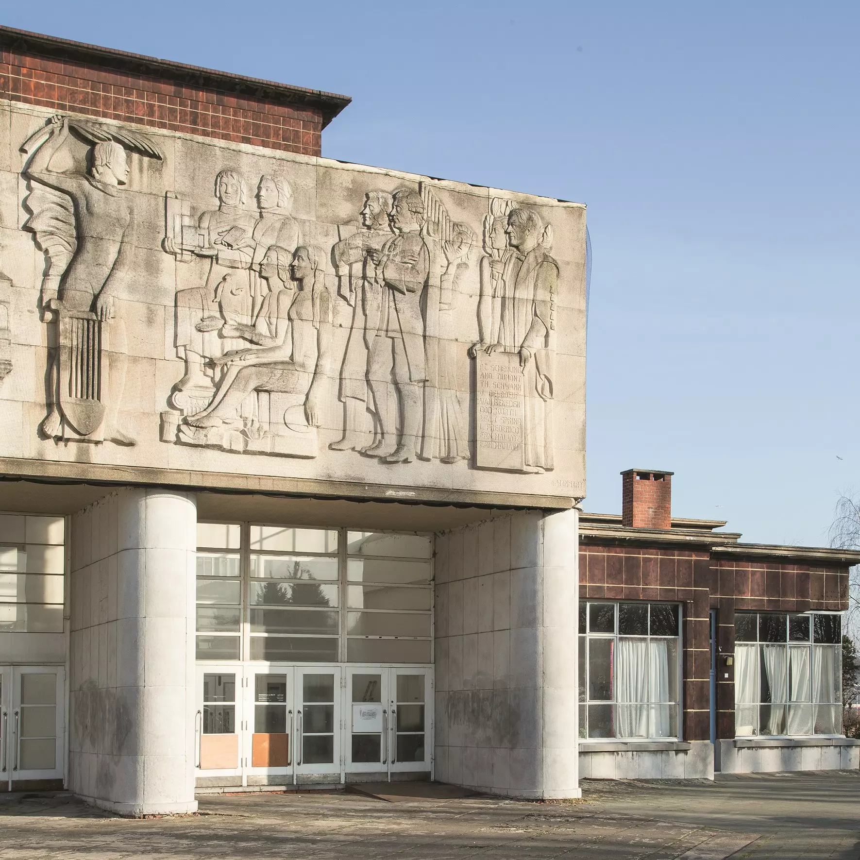 Le sculpteur Adelin Salle réalise ici deux bas-reliefs, un buste et un Dionysos dansant au rythme du tambourin. L'œuvre la plus marquante est le bas-relief d'Adolphe Wansart, couvrant toute la largeur de l'entrée principale : Liège, les Sciences et les Arts. De part et d'autre de l'allégorie de la Ville, l'histoire industrielle et culturelle liégeoise est représentée : à gauche, la muse de l'électricité fait face à l'armurier et au Val Saint-Lambert et, à droite, la muse des arts et des sciences toise les allégories des arts, Grétry et Franck. Assez curieusement, le trait oscille, d'un personnage à l'autre, entre stylisation et réalisme.