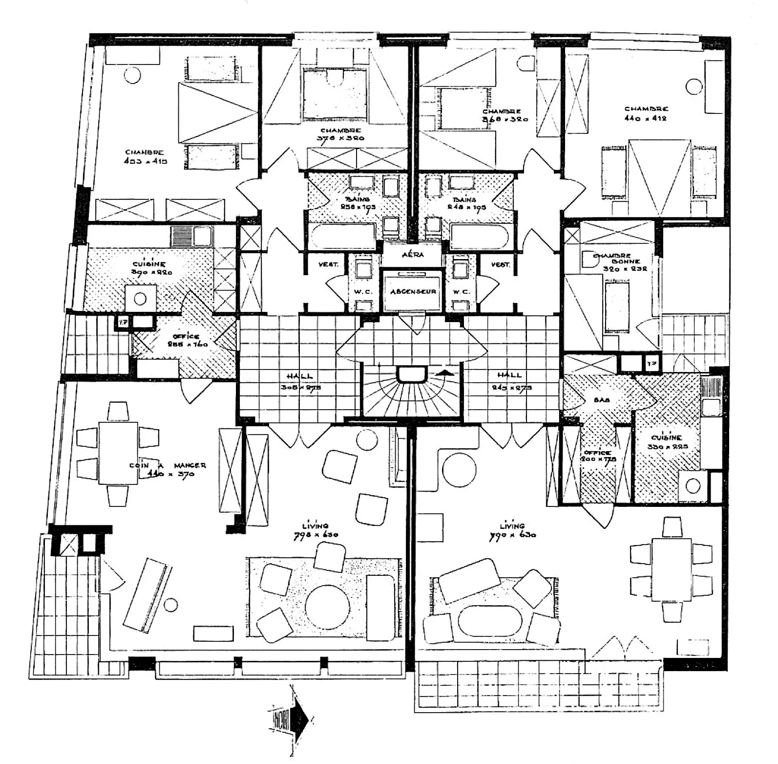 Construit sur ossature en béton armé et recouvert de pierre reconstituée (petit granit) – comme pour les résidences voisines Notger I (1953), Notger II (1954), Verhaeren (1959) et Europe (1959) des mêmes concepteurs –, cet immeuble est le fruit du début de la collaboration entre Poskin et Bonhomme, deux figures appelées à devenir incontournables dans la construction en hauteur. Avec ses grandes terrasses et larges fenêtres, la résidence trahit l'influence grandissante au sein de l'association du jeune Henri Bonhomme. Elle intègre au rez-de-chaussée une œuvre du plasticien Rets (fresque abstraite en zinc émaillé).