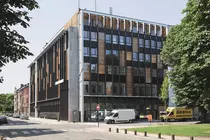 Pour répondre aux normes énergétiques actuelles, l'arrière a été isolé par l'extérieur (crépi). En façade avant, animée par un bardage bois plein ou ajouré, l'isolant a été placé à l'intérieur afin de laisser s'exprimer la trame originelle en béton, dans le respect du bâti initial, très bien dessiné, comme la cage d'escalier et le mât d'éclairage de la rue, intégré à la composition.