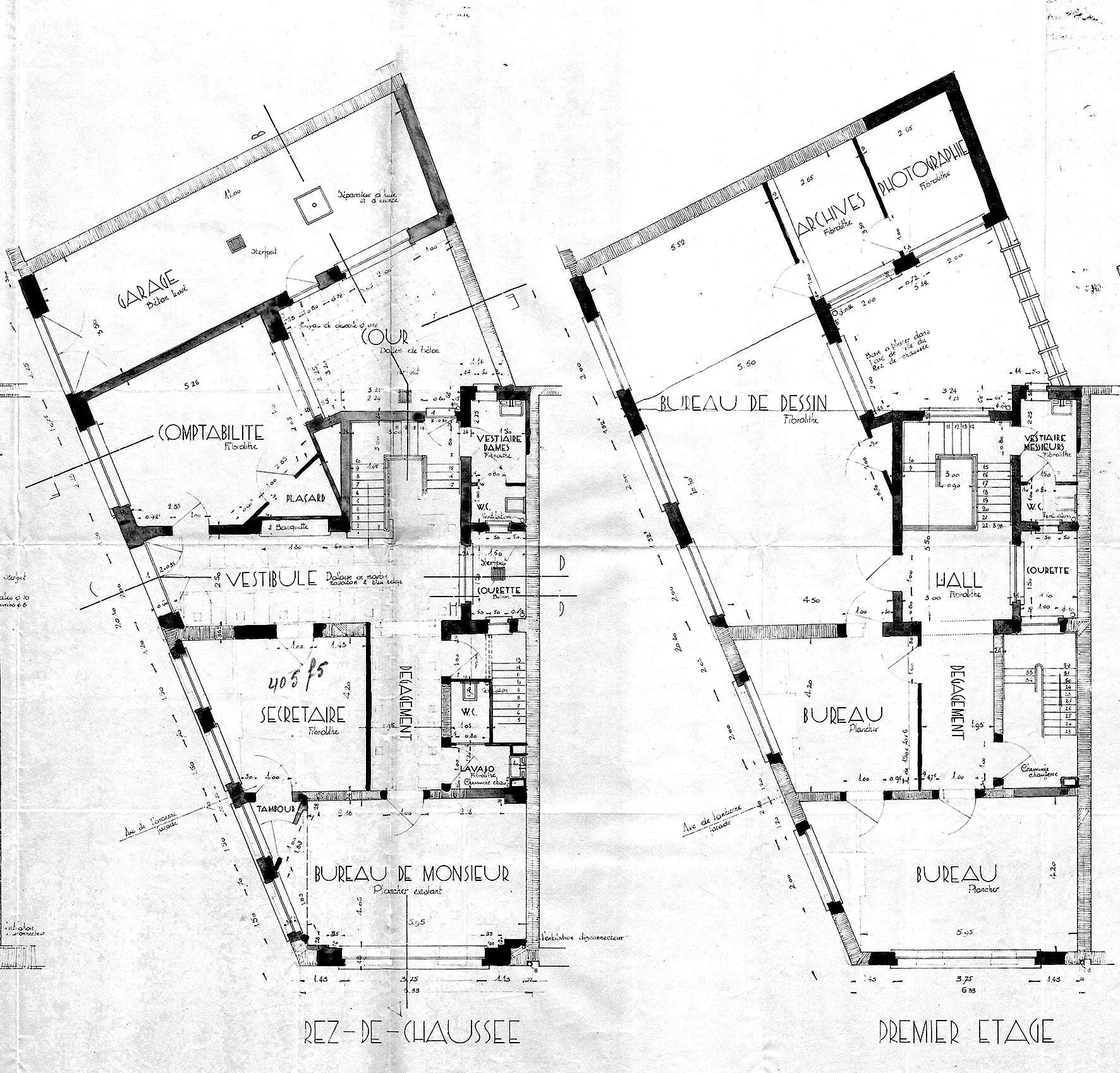 Le programme prévoit un ensemble de bureaux ainsi qu'un appartement. Sur un terrain hors d'équerre, l'architecte concentre les espaces administratifs (bureau du directeur, secrétariat et comptabilité) au rez-de-chaussée et les espaces techniques (bureaux, salle de dessin, local des archives, espaces pour la photographie) au premier. Au deuxième étage, un appartement probablement dédié au concierge, vu ses dimensions réduites, compte une chambre et une grande salle à manger.
