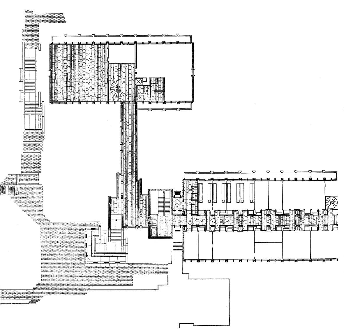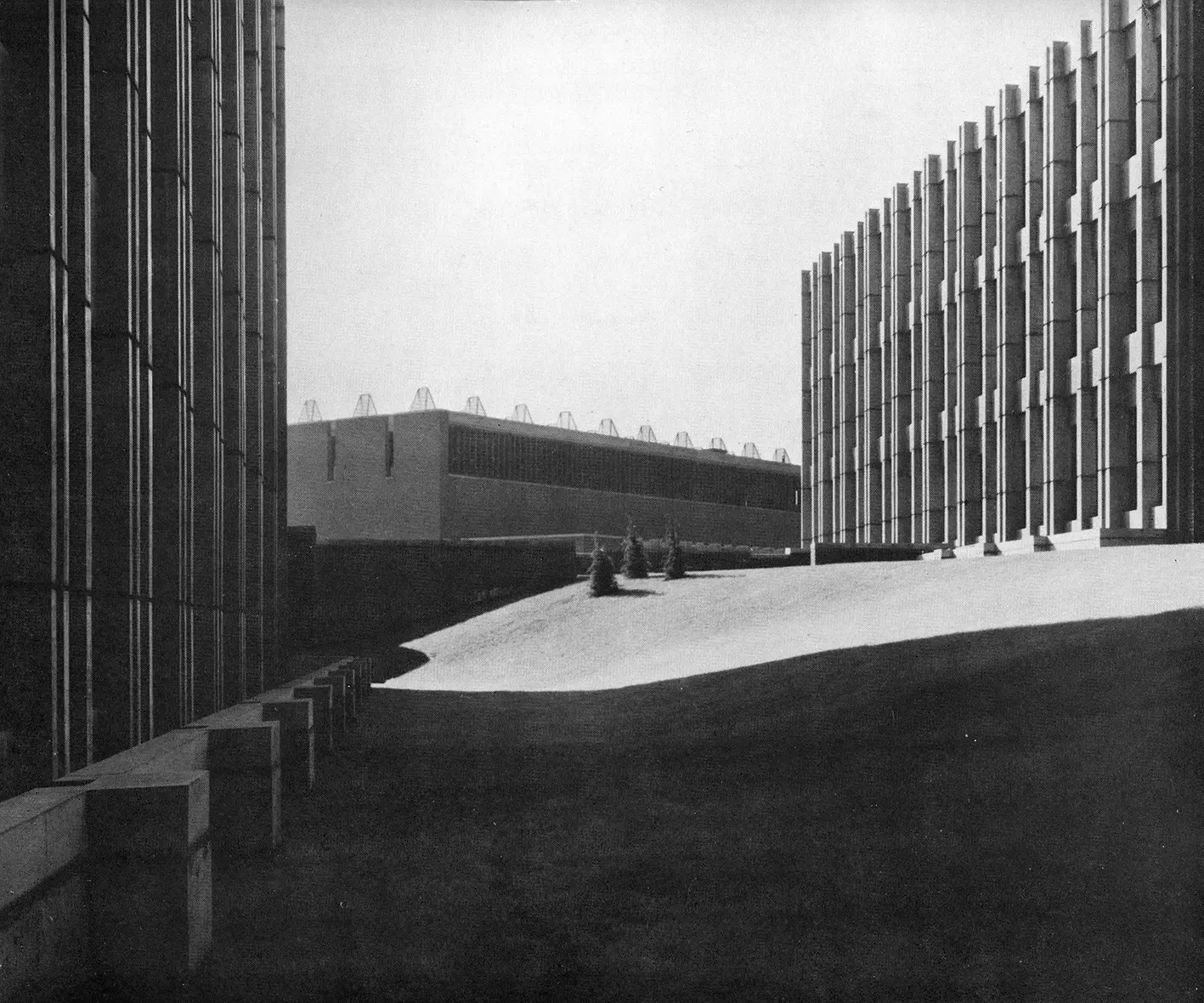Jouant remarquablement de l'implantation, des éléments structurels (ossature et façades en béton préfabriqué, libérant des espaces de plan libre) et de la matérialité des parements (escaliers et pignons en briques apparentes, revêtement de sol en petit granit), Charles Vandenhove développe une composition puissante, déclinée à la même époque dans une série de bâtiments dont il est l'auteur et qui sont remarqués par la critique : Institut médico-légal de Liège, résidence Lucien Brull et sa maison personnelle.
