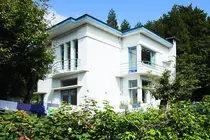 L'architecte opte pour un toit plat débordant, des fenêtres aux fins châssis et des auvents qui surplombent les baies du rez-de-chaussée, soulignant ainsi l'horizontalité de la construction. Seuls des balcons de forme courbe interrompent l'orthogonalité générale de la maison.