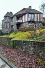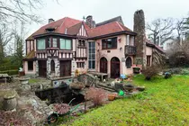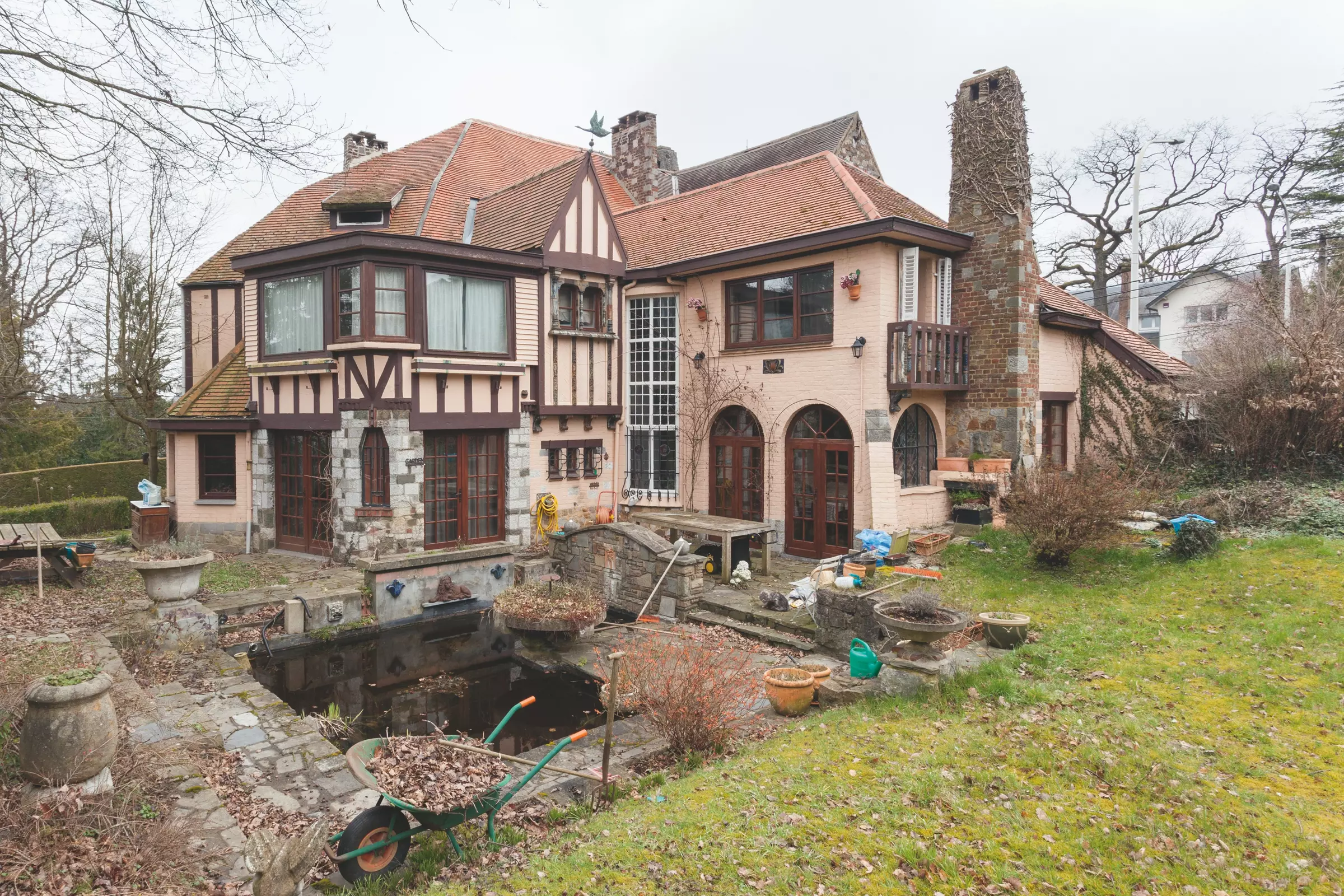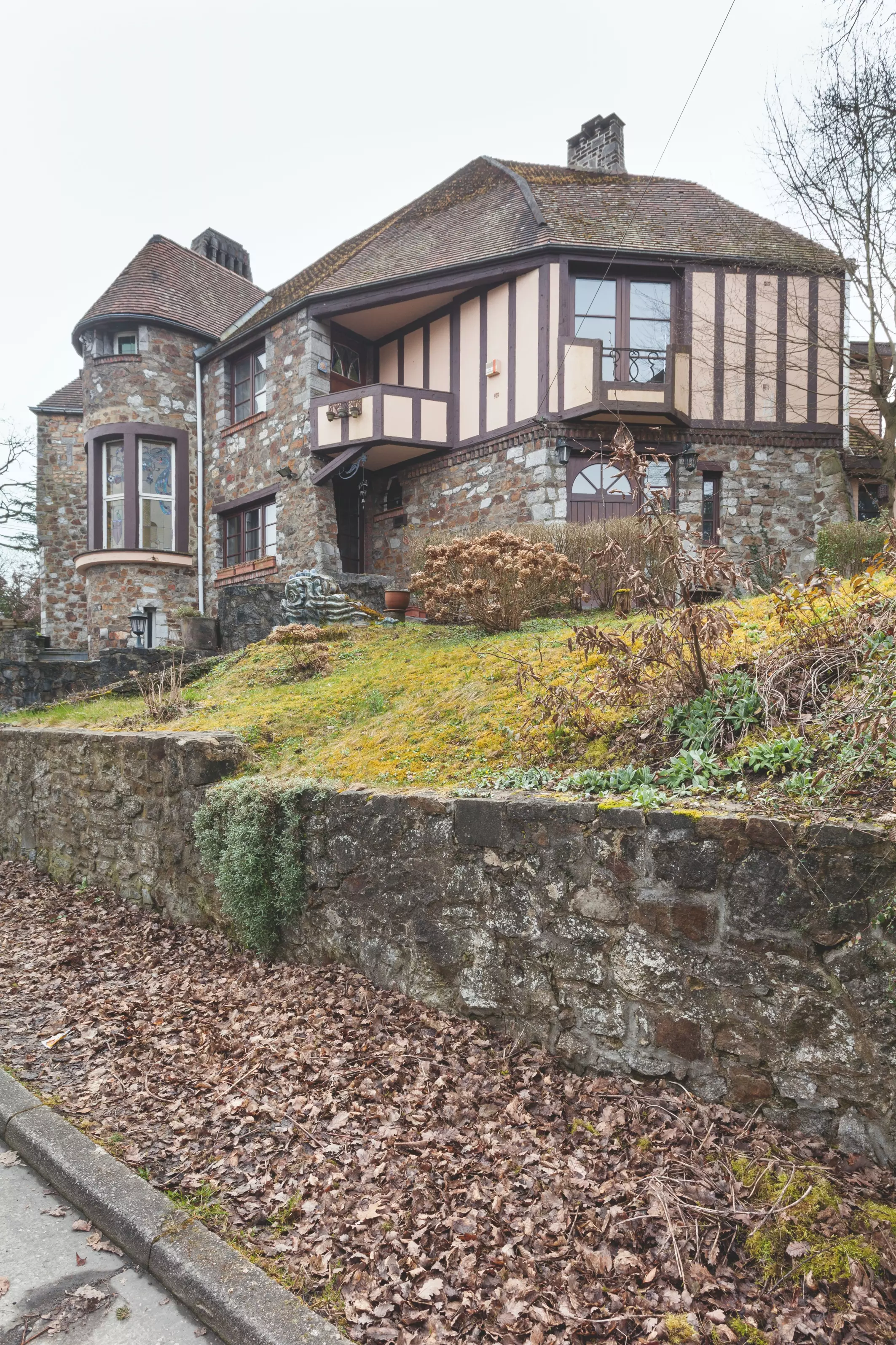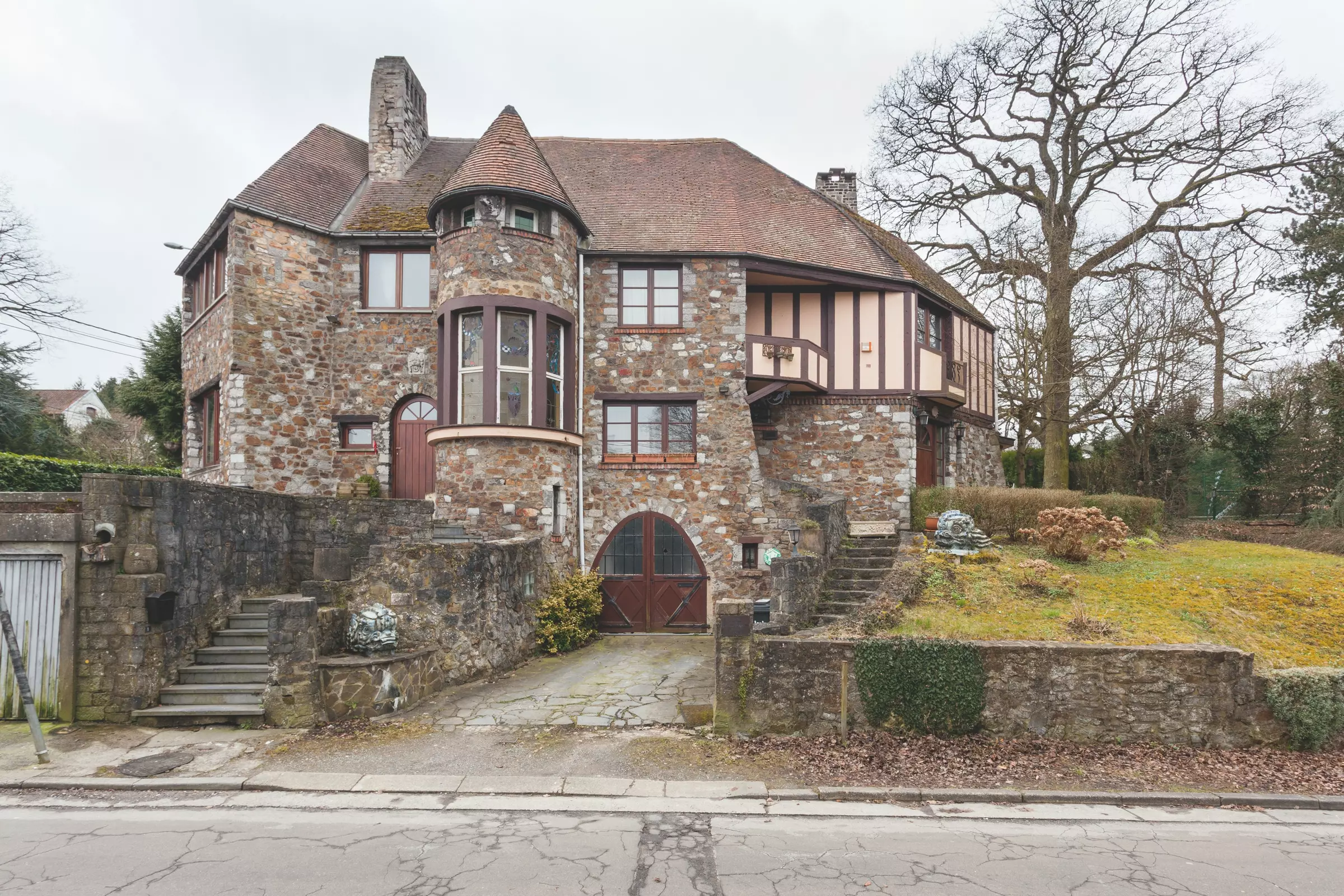 Malgré la masse, l'architecture est sensible et légère. L'effet de boîte compacte est évité par le biais des éclatements de coin. Ceux-ci créent de l'intimité à l'entrée, de la quiétude et un abri pour les terrasses du jardin. La tour de guet, arrondie, crée une charnière entre les deux habitations et sert de circulation verticale à la maison. La dualité des façades se ressent naturellement. En fonction de leur situation, la matérialité des surfaces des murs change. Côté rue, la façade est faite de pierre rugueuse, côté jardin, elle est plus fantaisiste, avec des colombages et des céramiques colorées. L'intégration d'anciens morceaux de sculpture à la façade lui donne une certaine animation.