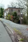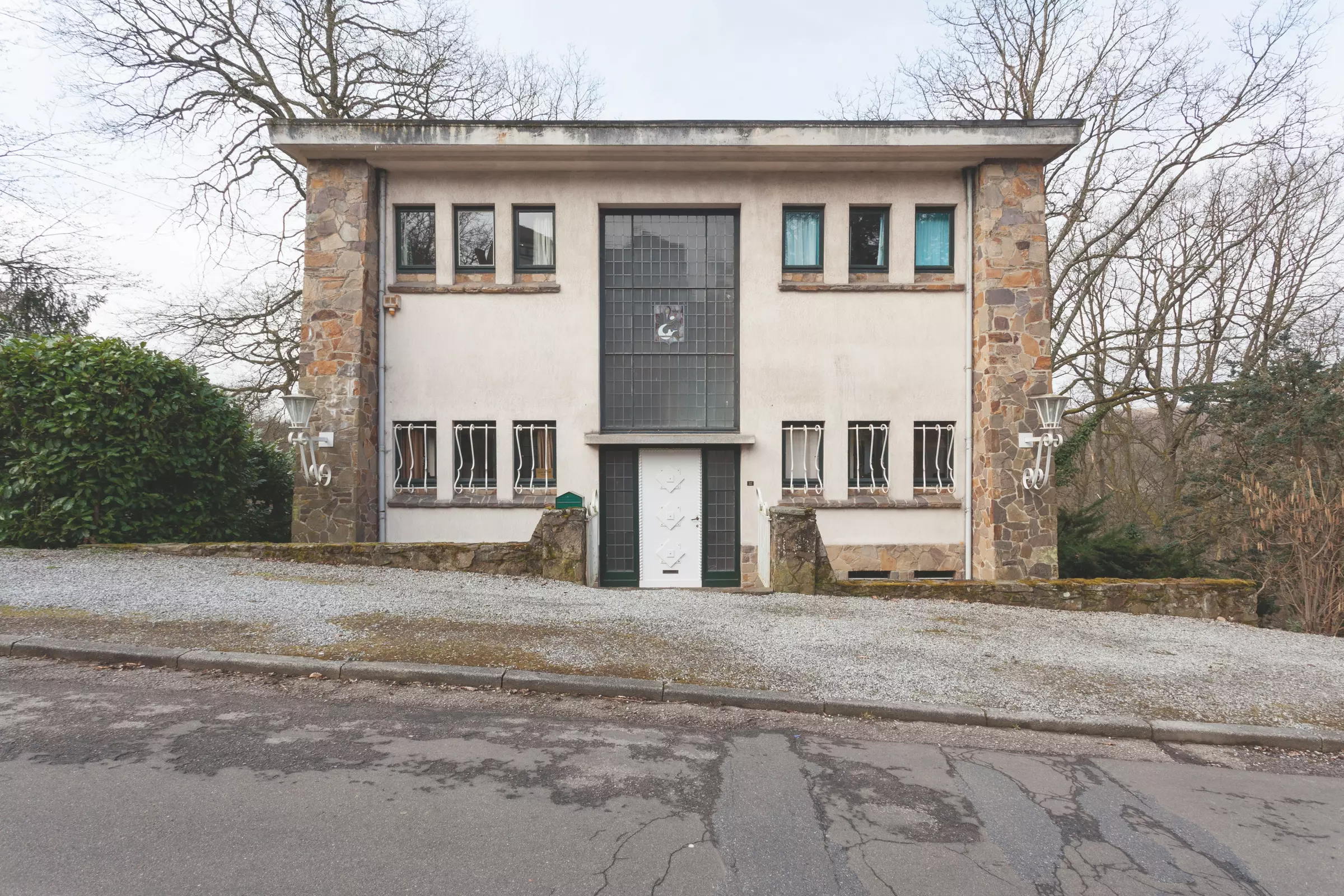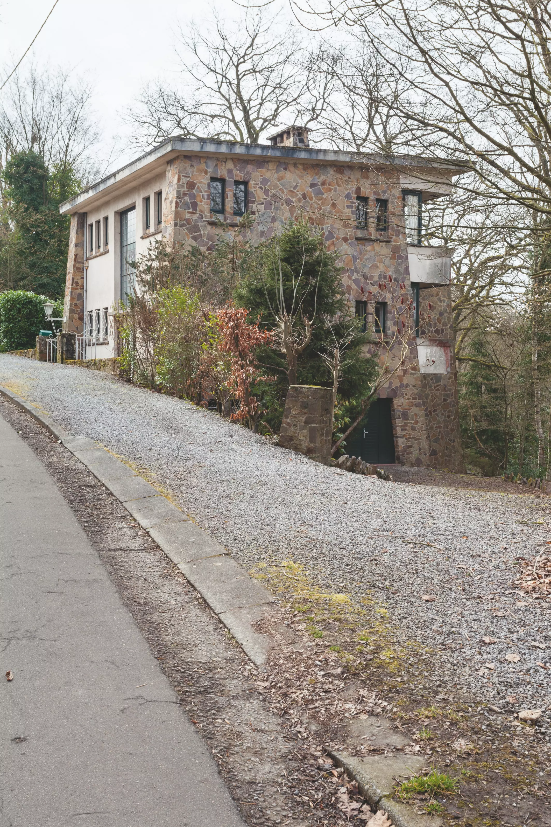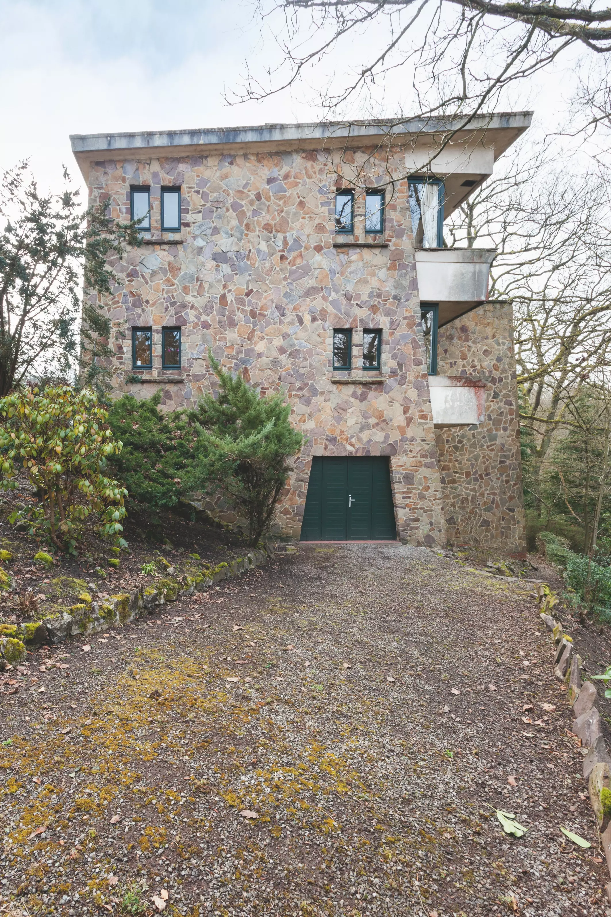 Entre deux trapèzes de pierre reposent des niveaux successifs : le garage, au sous-sol, de plain-pied avec le jardin extérieur, le living, au niveau de la route supérieure, offrant une vue sur la vallée, et, au second niveau, les chambres.