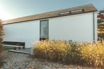 En réponse au paysage agricole, le projet réinterprète la typologie de la ferme traditionnelle dans une écriture contemporaine : volume pur, grandes surfaces immaculées (côté rue) et grandes baies vitrées (côté jardin).