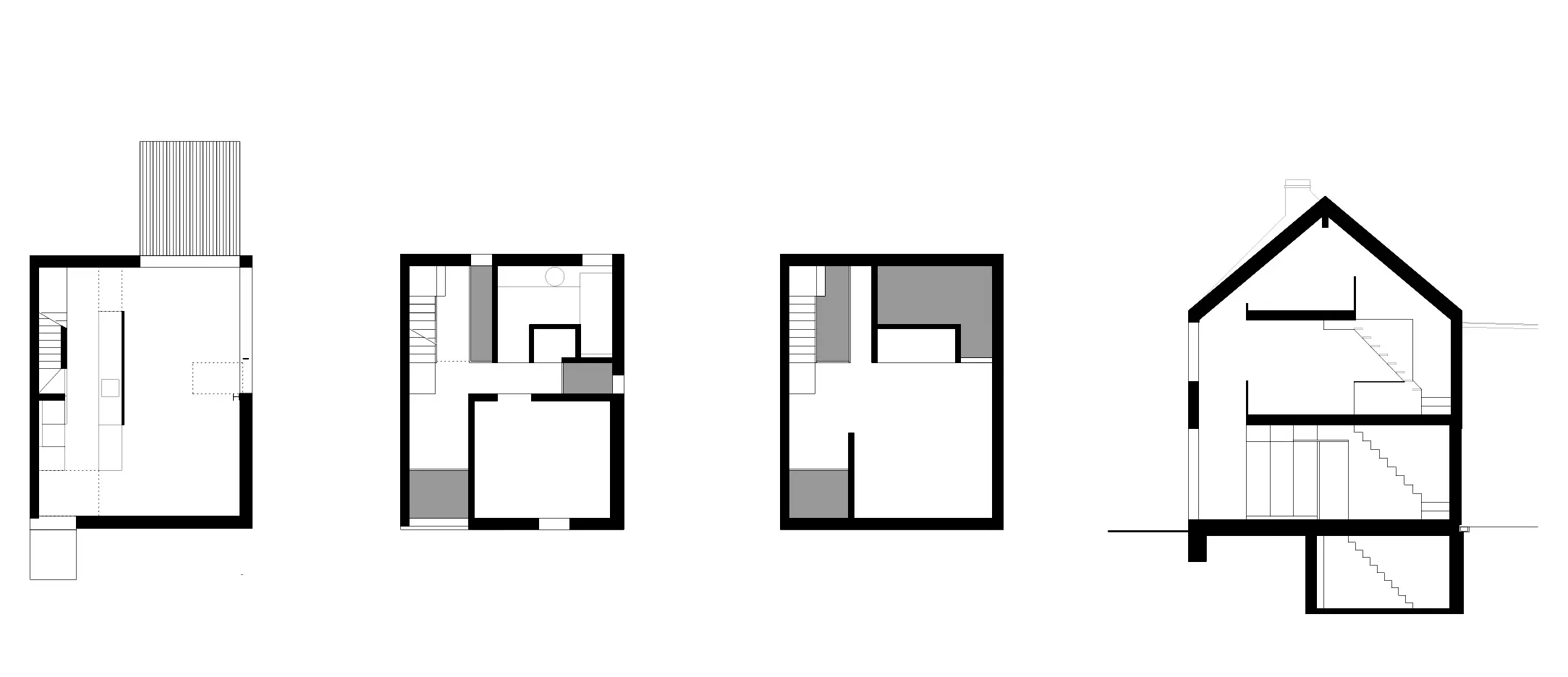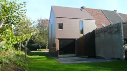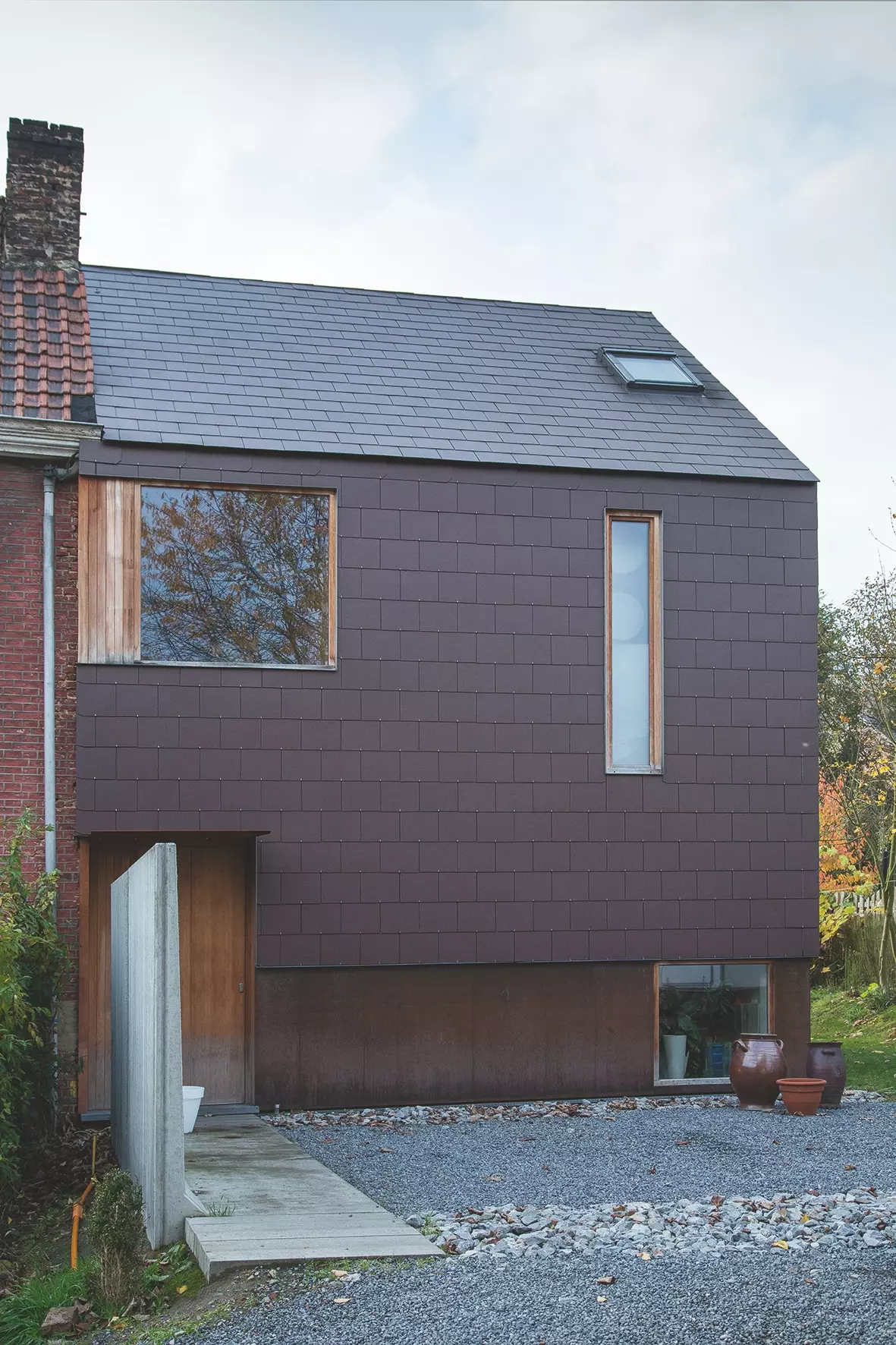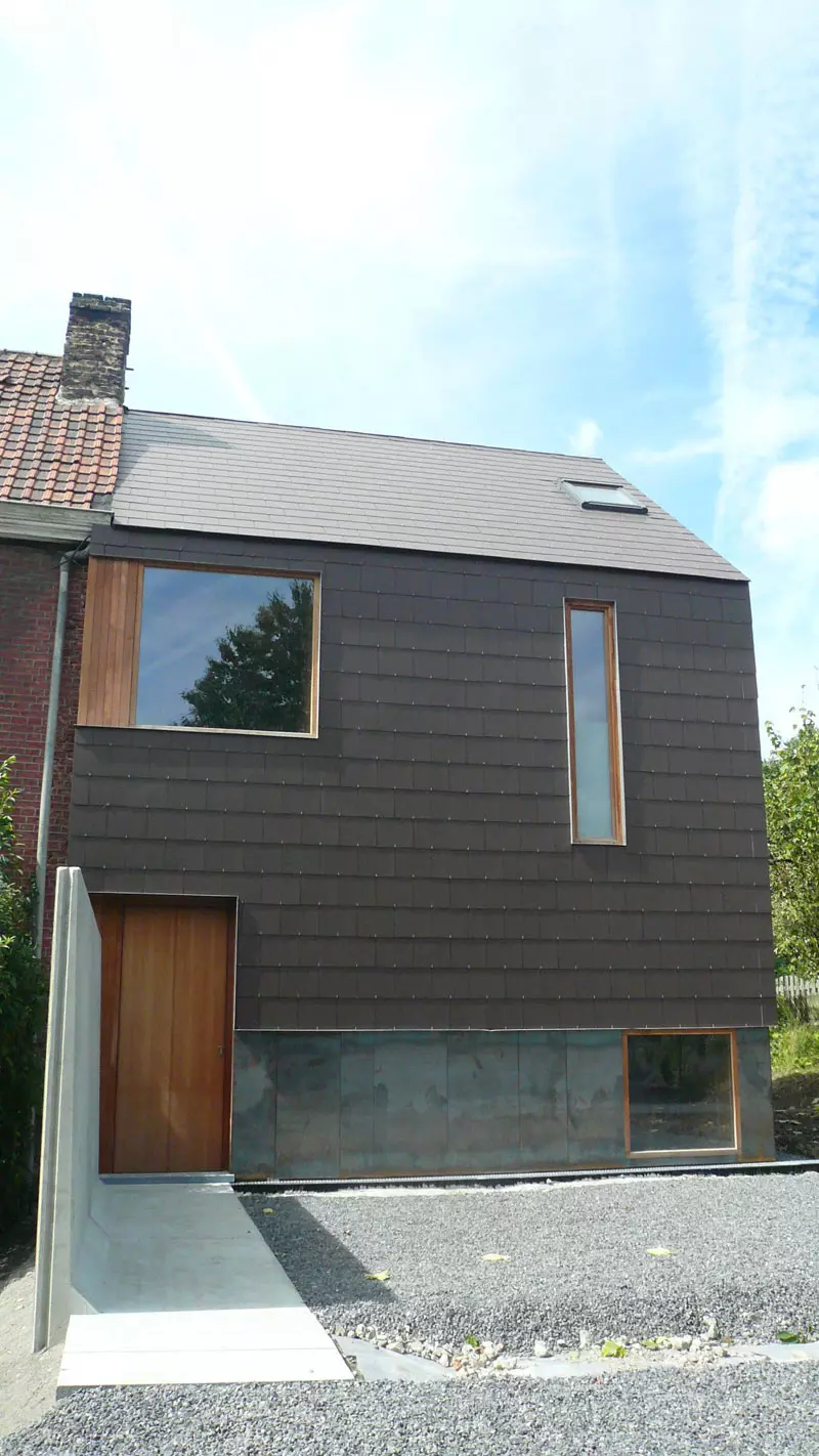 Sur les hauteurs de Liège, entre ville et campagne, cette rénovation a permis de transformer une maison dite insalubre en habitation basse énergie de 115 m². Le bâtiment, semi-mitoyen, s'inscrit dans un ensemble de petites maisons minières. Pour garantir son intégration après la nouvelle intervention, le projet respecte les gabarits en place et le principe fonctionnel des habitats de l'époque. La maison est construite en ossature bois et ses façades sont bardées d'ardoises et de tôles laminées, un choix défini par une réflexion sur les matières et les teintes urbaines. Malgré une surface au sol réduite (42 m²), un travail sur la verticalité des espaces et les relations entre les différents niveaux offre aujourd'hui aux habitants de nouvelles perspectives intérieures et de nombreuses prises de lumière naturelle.