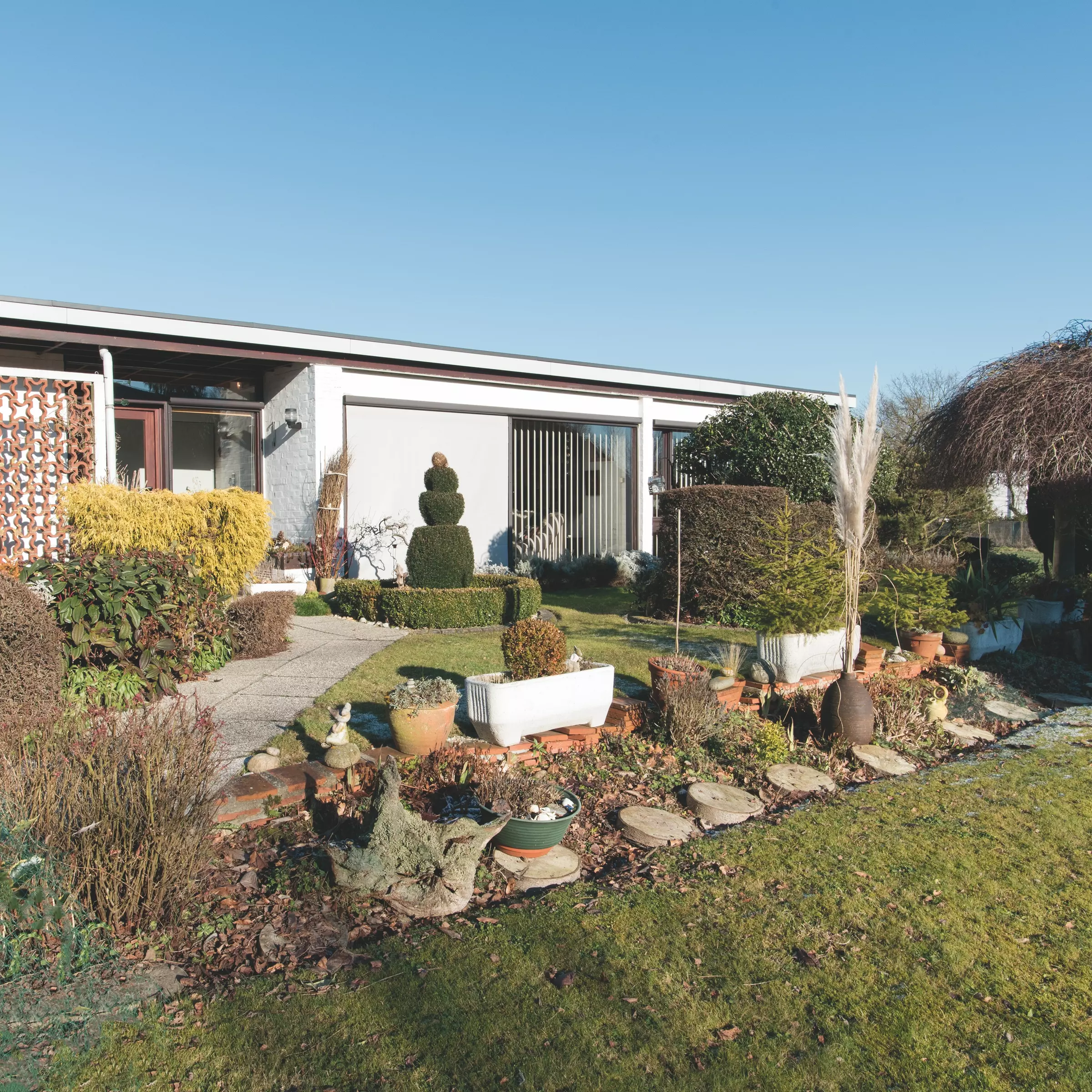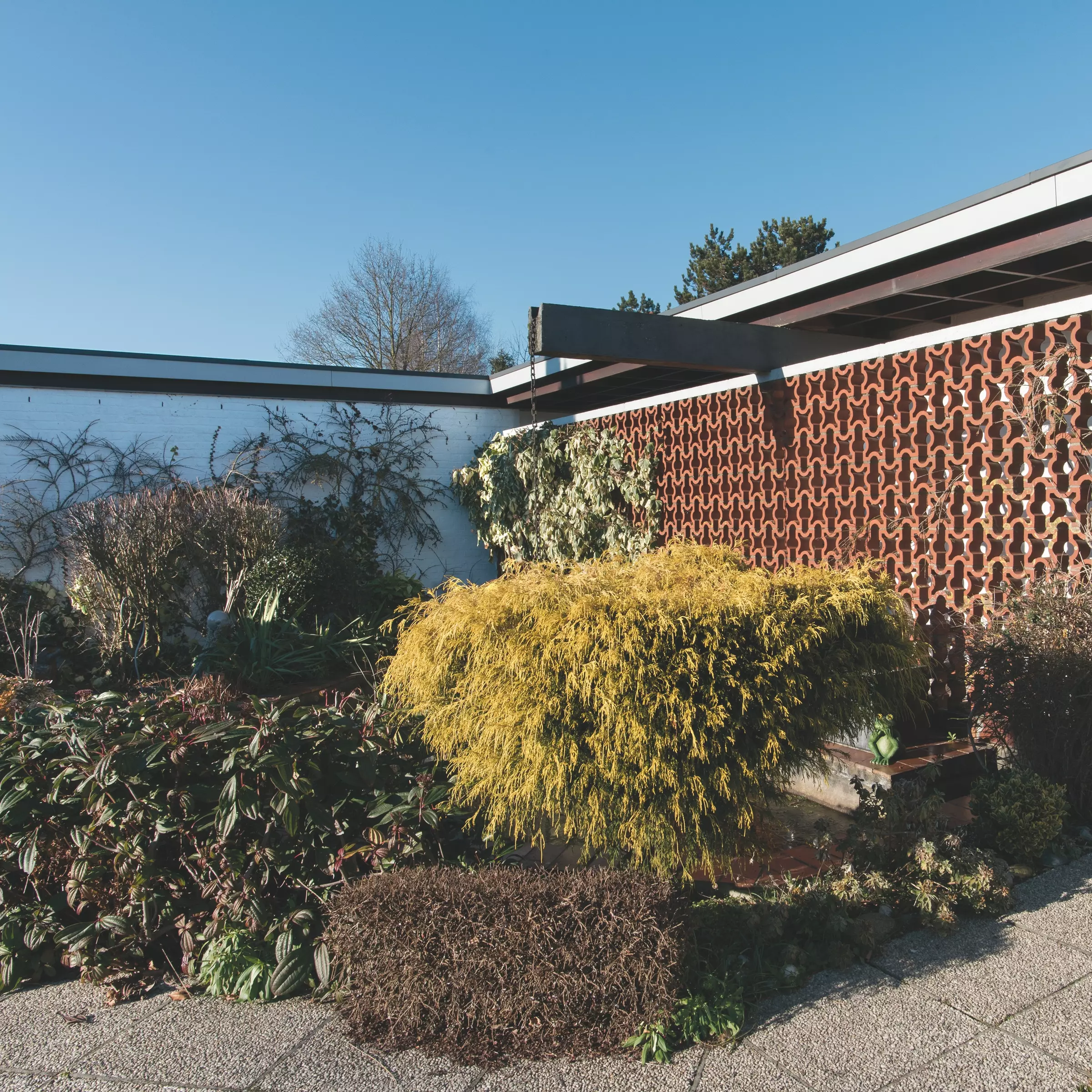 Au milieu d'un jardin rural de 16a, cette habitation est dessinée à la fin des années 1960 par l'architecte Desmet (également professeur) selon un programme mûrement discuté avec les commanditaires. La maison de plain-pied et à toiture plate est constituée de cinq éléments de 5 m de largeur. Elle intègre deux garages bien affirmés dans l'agencement, un patio et trois chambres. Un claustra en terre cuite d'inspiration hispanique marque l'entrée, une invitation au voyage imaginaire. De grandes baies vitrées entretiennent une relation permanente entre intérieur et extérieur. Le séjour se prolonge, sans subdivision, par un coin du feu surbaissé dont la cheminée suspendue, en cuivre, a été dessinée par l'architecte, ainsi que les bibliothèques en wengé assorties aux portes. Un carrelage de terre cuite émaillée et des tapis plains composent les sols. Les murs sont en briques peintes en blanc, et les plafonds sont à caissons de bois ou à larges lattes. L'esprit vintage est garanti d'époque.