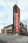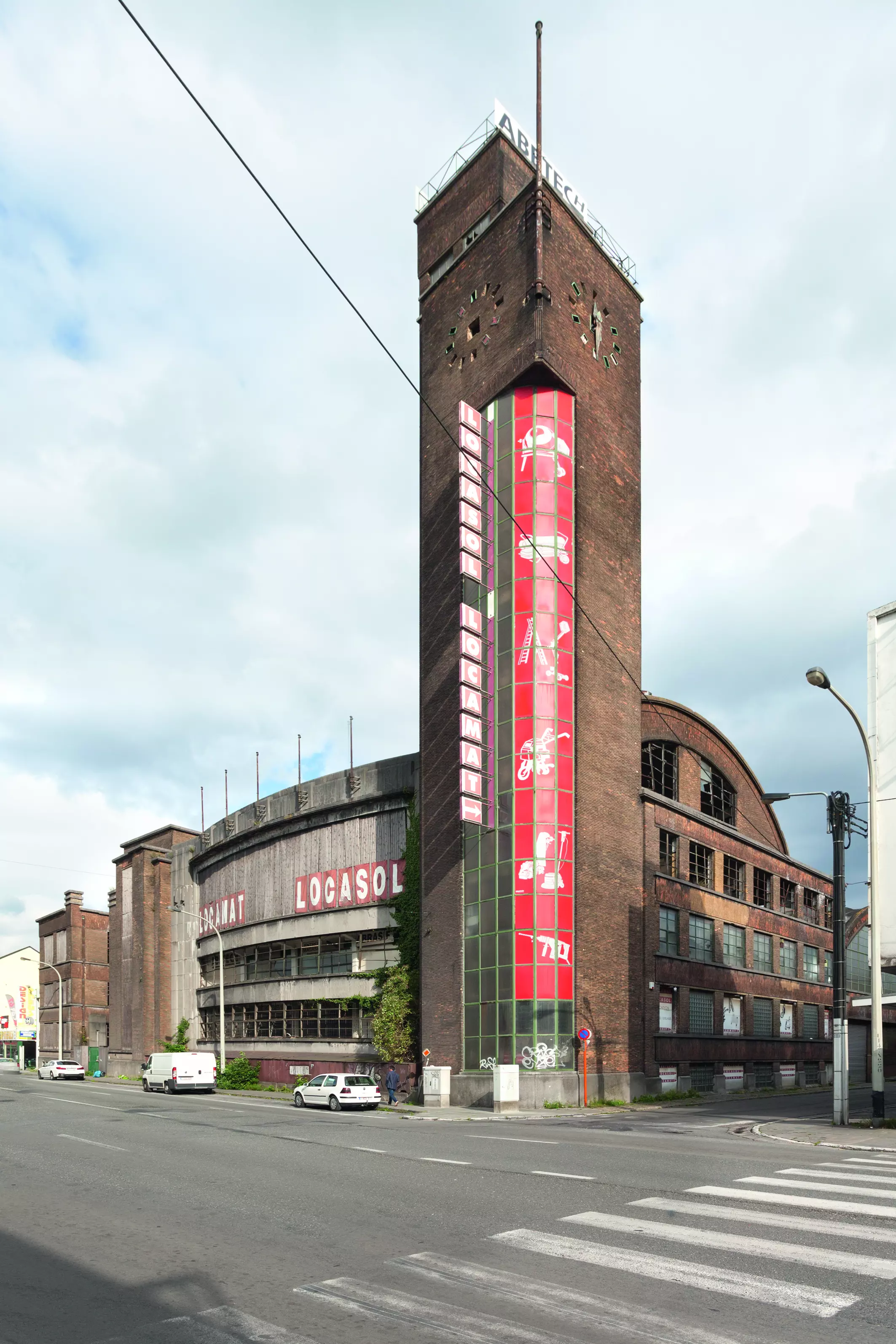 Une horloge à trois cadrans et le nom de la brasserie, en lettres néon, dominent son sommet – où la salle de dégustation offre une vue imprenable sur la région, accessible par un ascenseur et par la cage d'escalier éclairée sur toute sa hauteur d'une verrière en quart de rond.