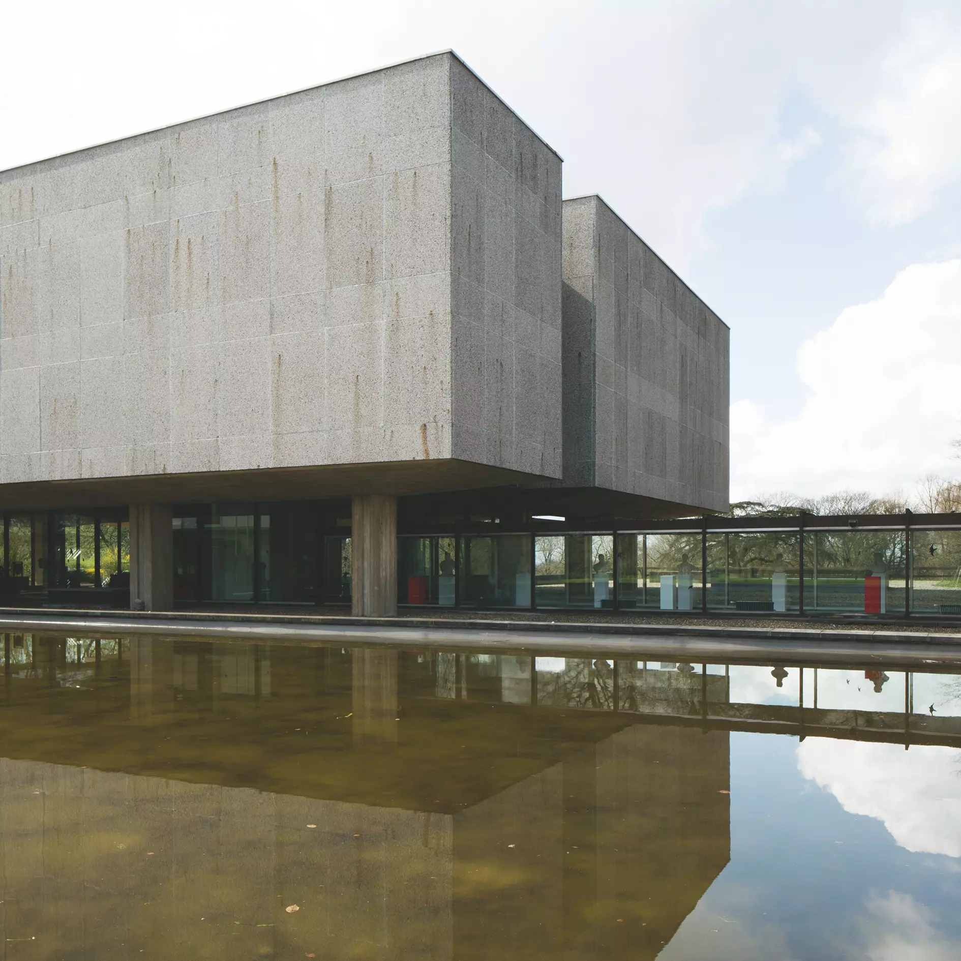 Pour accéder à l'entrée du musée, le public contourne ce volume dont il ne perçoit d'abord qu'un mur rideau en pierre bleue bordant un bassin. Cette entrée, presque dérobée, traitée comme celle d'une habitation privée, imposant au visiteur un cheminement dans l'esprit romantique du parc, s'est immédiatement avérée trop peu lisible et a nécessité la pose d'une sculpture signal, œuvre de Francis Dusépulchre (1934-2013).