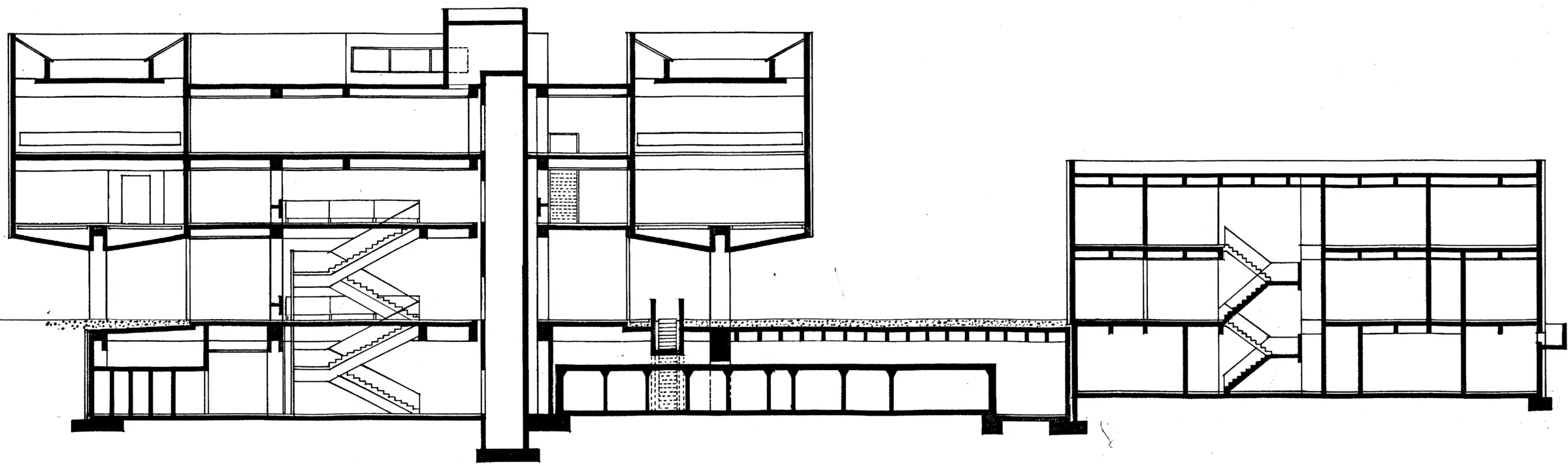 Dans la partie nord, on trouve les locaux administratifs comprenant bureaux, bibliothèque précieuse et centre de documentation. Les espaces dévolus aux collections sont agencés dans un grand volume cubique posé sur pilotis. Ce dispositif crée un vaste hall vitré à 360° concentrant initialement les services d'accueil. Ses portes reçoivent de très sculpturales poignées en verre coloré dessinées par Andrée Willequet (1921-1998). De là, on accède aux quatre salles du premier étage dédiées aux grandes civilisations et disposées selon un plan original en svastika.