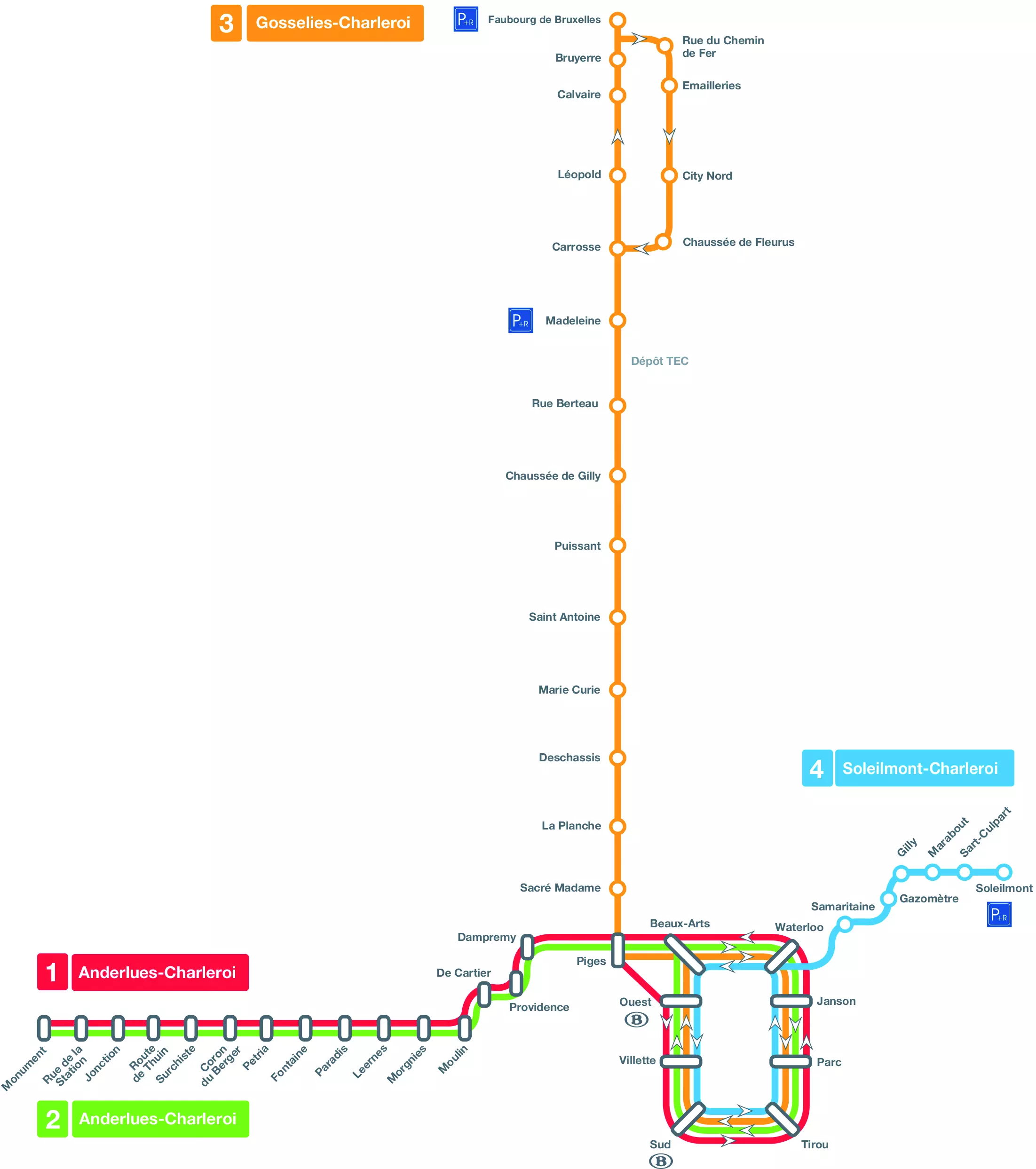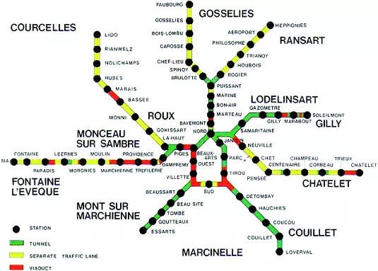 Parcourir le métro léger est l'une des expériences urbaines les plus déroutantes, et en même temps l'une des plus fascinantes de Charleroi. En effet, les trois branches du réseau actuellement en service ont été conçues avec des moyens financiers différents, et suivant des paradigmes d'aménagement de l'espace qui ont évolué au cours du temps et en fonction de plusieurs paradigmes des transports publics urbains de masse : métro, tram, voire le train-tram. L'emprunter revient à opérer la synthèse entre l'expérience du métro (vécue dans les grandes stations telles que Beaux-Arts, Waterloo, Ouest), celle du tram inséré dans l'espace public sur le modèle français en sites propres (tronçon de la boucle centrale inaugurée en 2012 entre les stations Parc et Sud, l'antenne de Gosselies inaugurée en 2013) ou encore l'expérience du train-tram desservant vers l'ouest de l'agglomération des tissus urbains de basses densités et empruntant des infrastructures ferroviaires qui lui sont propres (antenne d'Anderlues, inaugurée par phase au cours de la décennie des années 1980). Le réseau du métro léger permet aux voyageurs d'expérimenter des paysages uniques de Charleroi, en particulier sur la branche d'Anderlues et sur la boucle centrale, côté ouest. Initié au début des années 1960, inauguré le 21 juin 1976 (entre les stations « Villette » et « Sud »), le réseau devait compter soixante-neuf stations et mesurer 52 kilomètres de long, mais verra son ambition baisser avec la régionalisation de la politique des transports urbains (1991), pour proposer aujourd'hui quarante-huit stations (dont 10 souterraines) sur une longueur de 33,3 km. Sa construction a été l'occasion de confier à des architectes – et des artistes plasticiens ou à des évocations de l'univers des éditions Dupuis (stations « Parc » et « Janson »), formant une galerie d'art accessible à tous – des missions d'aménagement des stations qui iront, suivant les typologies de l'aménagement d'intérieur d'un gros œuvre souterrain, à la conception d'ensembles aériens suspendus ou posés sur le sol. Plusieurs stations sont remarquables : la monumentale et postmoderne « Beaux-Arts » du Groupe Structures (1983) et celles de l'architecte carolorégien Jean Yernaux, comme « Waterloo » (1992), « Samaritaine », « Gazomètre » (1992, rénovées en 2013) et plusieurs de l'antenne vers Châtelet – dont les très belles stations « Pensée » –, partiellement aménagées et jamais exploitées. L'antenne vers Anderlues, construite et mise en exploitation la première, dans le courant des années 1980, se caractérise, quant à elle, par la présence de différentes stations d'inspiration brutaliste également réalisées par Jean Yernaux (Dampremy, Leernes, Piges, etc.). Souvent considéré comme l'un des « grands travaux inutiles », le métro léger est néanmoins un réseau unique en son genre en Wallonie, à partir duquel une politique volontariste d'aménagement du territoire peut être envisagée. Le Projet de Territoire (2015) développé par la majorité communale et Charleroi Bouwmeester en prend le parti, considérant le réseau de métro – complété des deux futures lignes de Bus à haut niveau de service (BHNS, vers Montigny-le-Tilleul et Loverval-Bultia) – comme l'armature lourde du développement territorial et paysager de l'agglomération à l'horizon 2025.