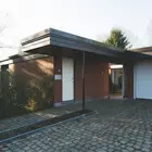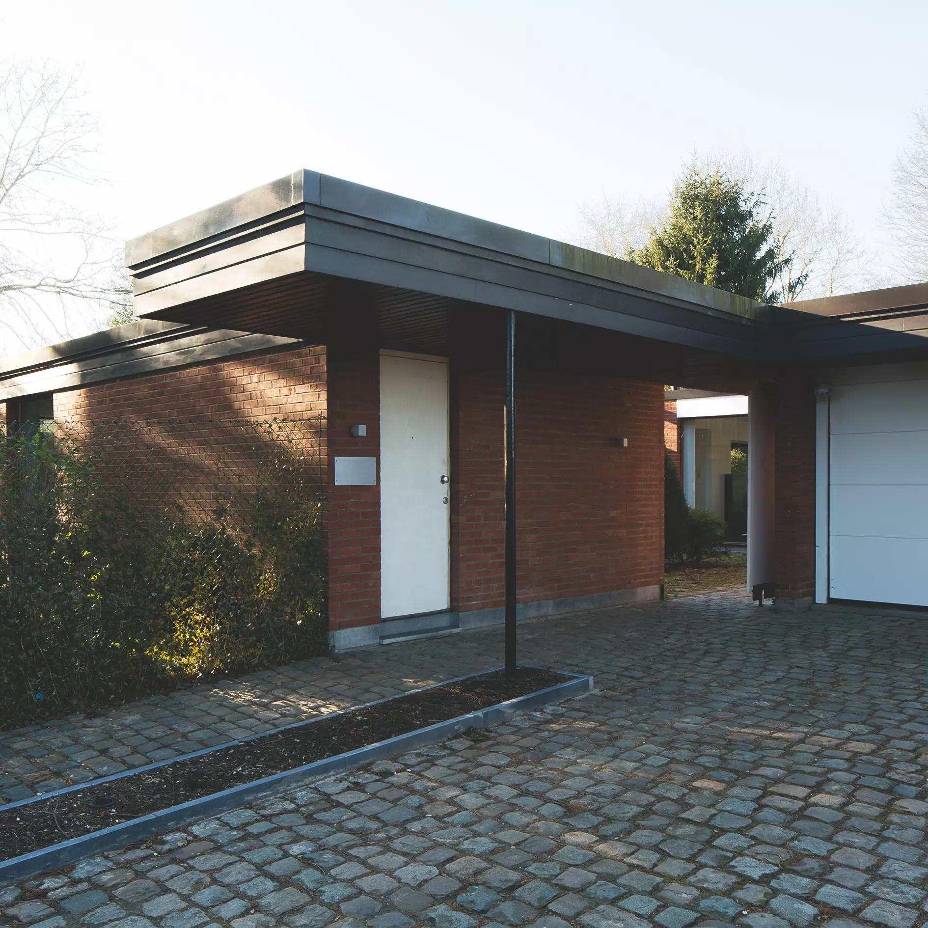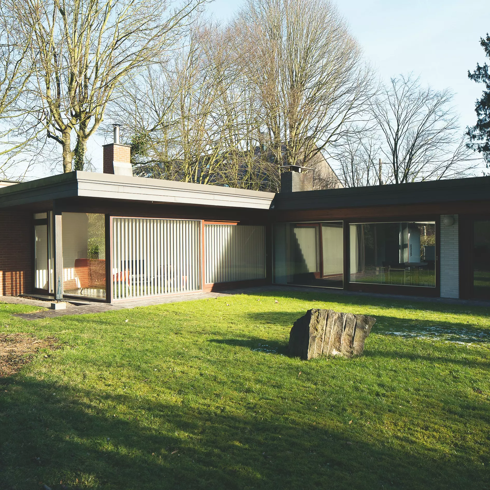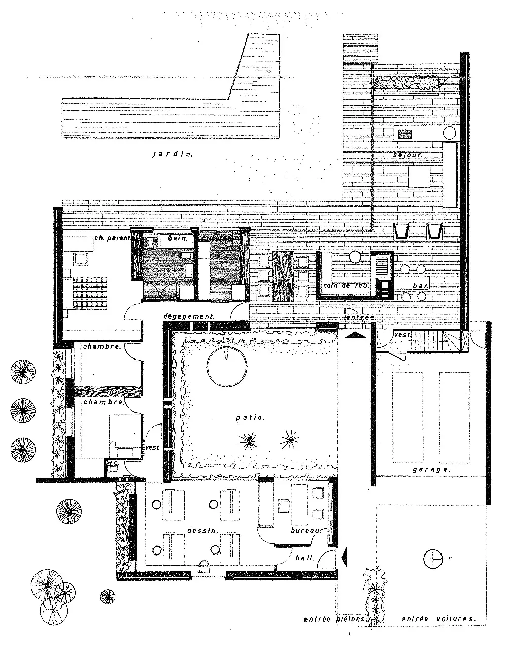 Masquée aujourd'hui par une végétation luxuriante, cette habitation de plain-pied est agencée autour d'un patio central ; véritable charnière entre les espaces de travail, de vie et de nuit. L'ancien atelier de l'architecte, situé face à la voirie, isole la partie logement de la circulation.