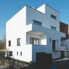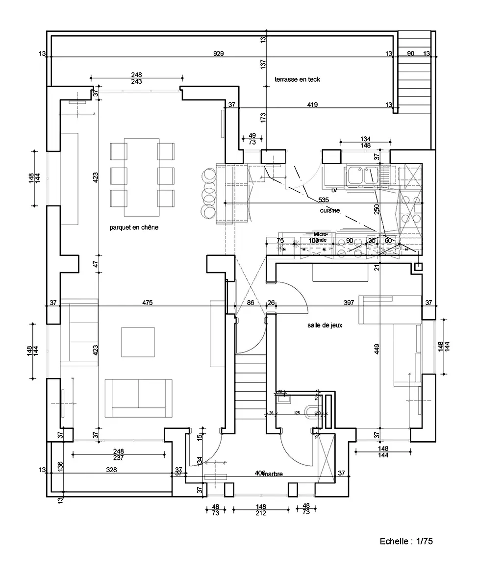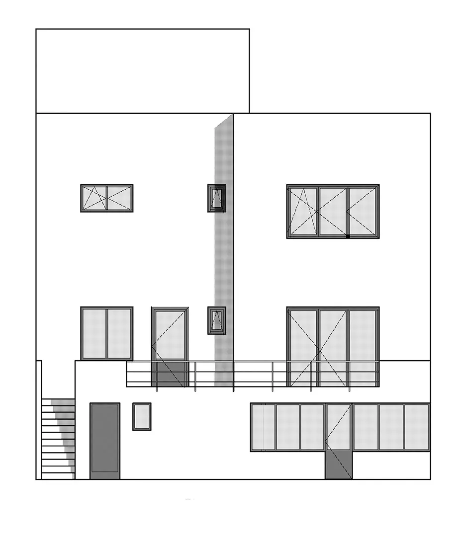 En façade principale, le jeu des décrochements des encorbellements aux proportions très équilibrées est accentué par celui des ombres. Le rythme des séquences entre les pleins et les vides correspond à l'agencement des espaces intérieurs (axe de distribution horizontal et vertical), ouvrant les pièces de vie sur le magnifique espace arboré à l'arrière, complété initialement par une petite serre chauffée.