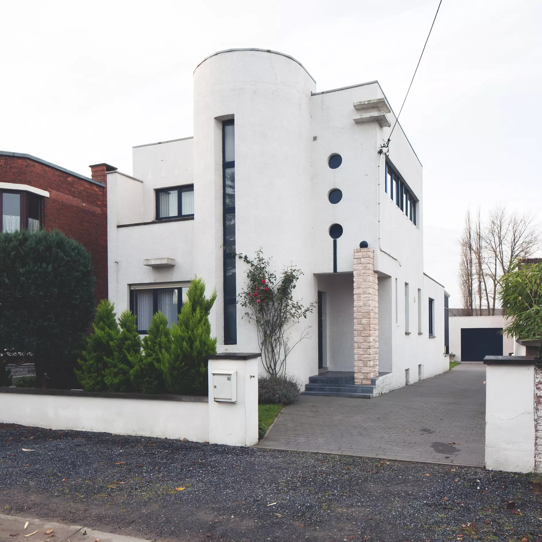 Implantée sur une parcelle longitudinale dans un contexte semi-urbain hétéroclite, la maison présente, au départ d'une construction en maçonnerie de briques, une écriture qui témoigne de l'assimilation des principales caractéristiques de l'architecture moderniste véhiculée par la presse belge spécialisée : enchevêtrement de volumes cubiques et cylindriques enduits de cimentage blanc, fenêtres en bandeau, toiture-terrasse et vitraux circulaires (hublots).