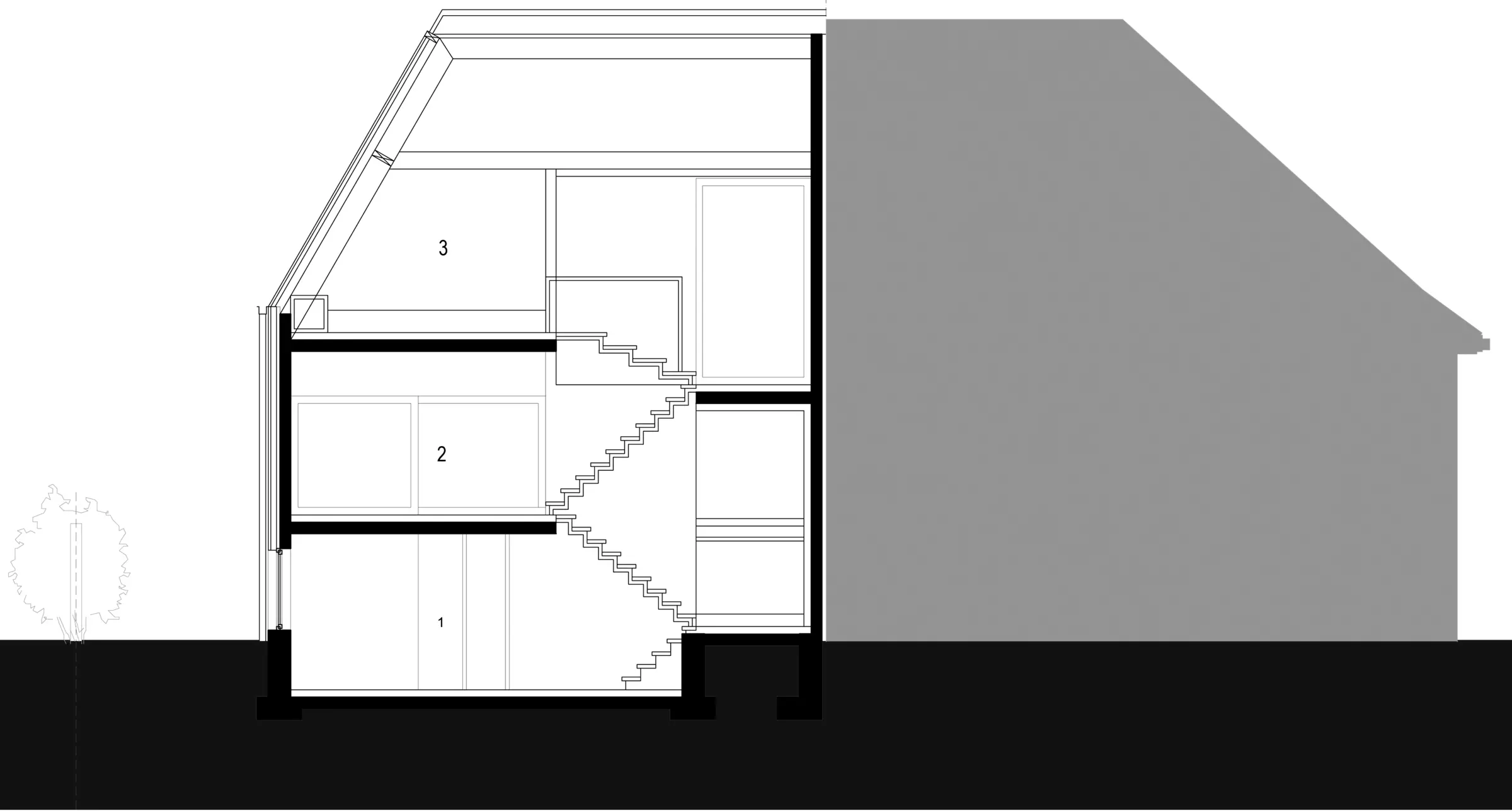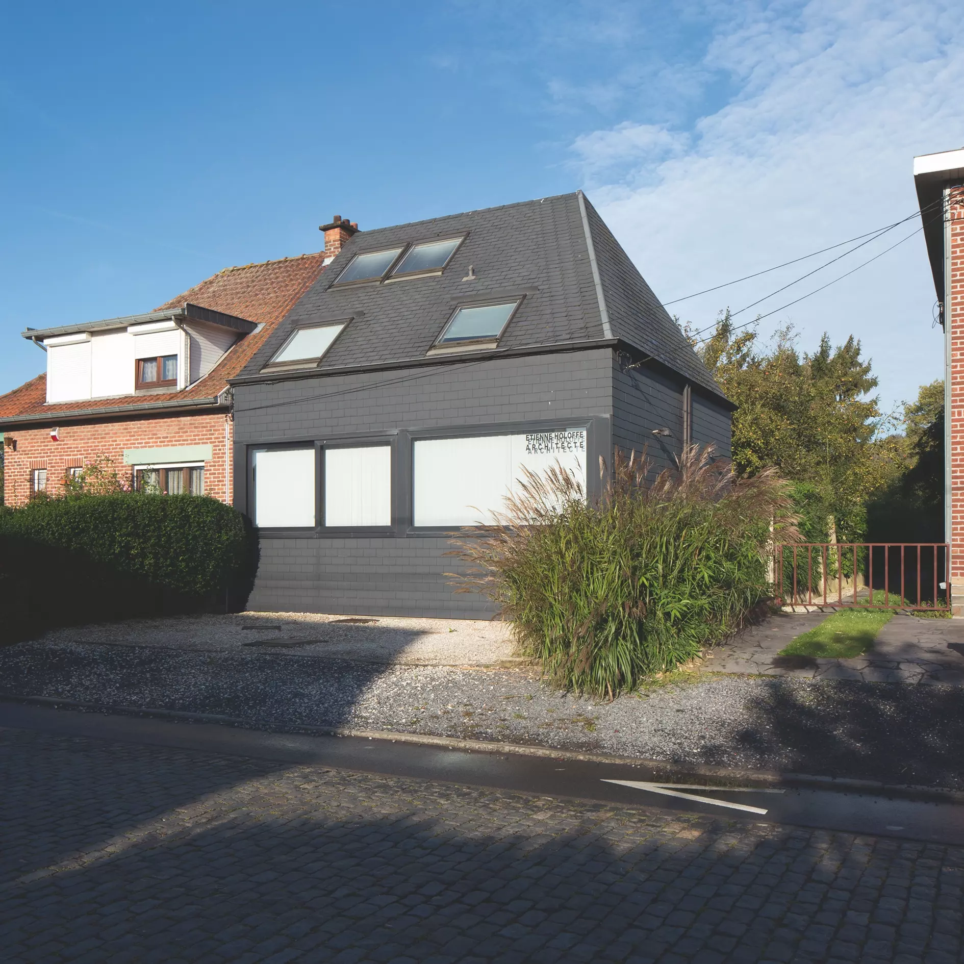 La construction s'inscrit dans le contexte d'un petit lotissement des années 1950 constitué de maisons jumelées mitoyennes. Bien que respectant les gabarits prescrits, elle tranche radicalement par son expression et l'utilisation de l'ardoise gris anthracite – seul matériau de revêtement pour les façades et toiture – conférant un aspect homogène et puissant : le contraste avec les habitations voisines, couvertes de tuiles et habillées de briques rouges, est saisissant.