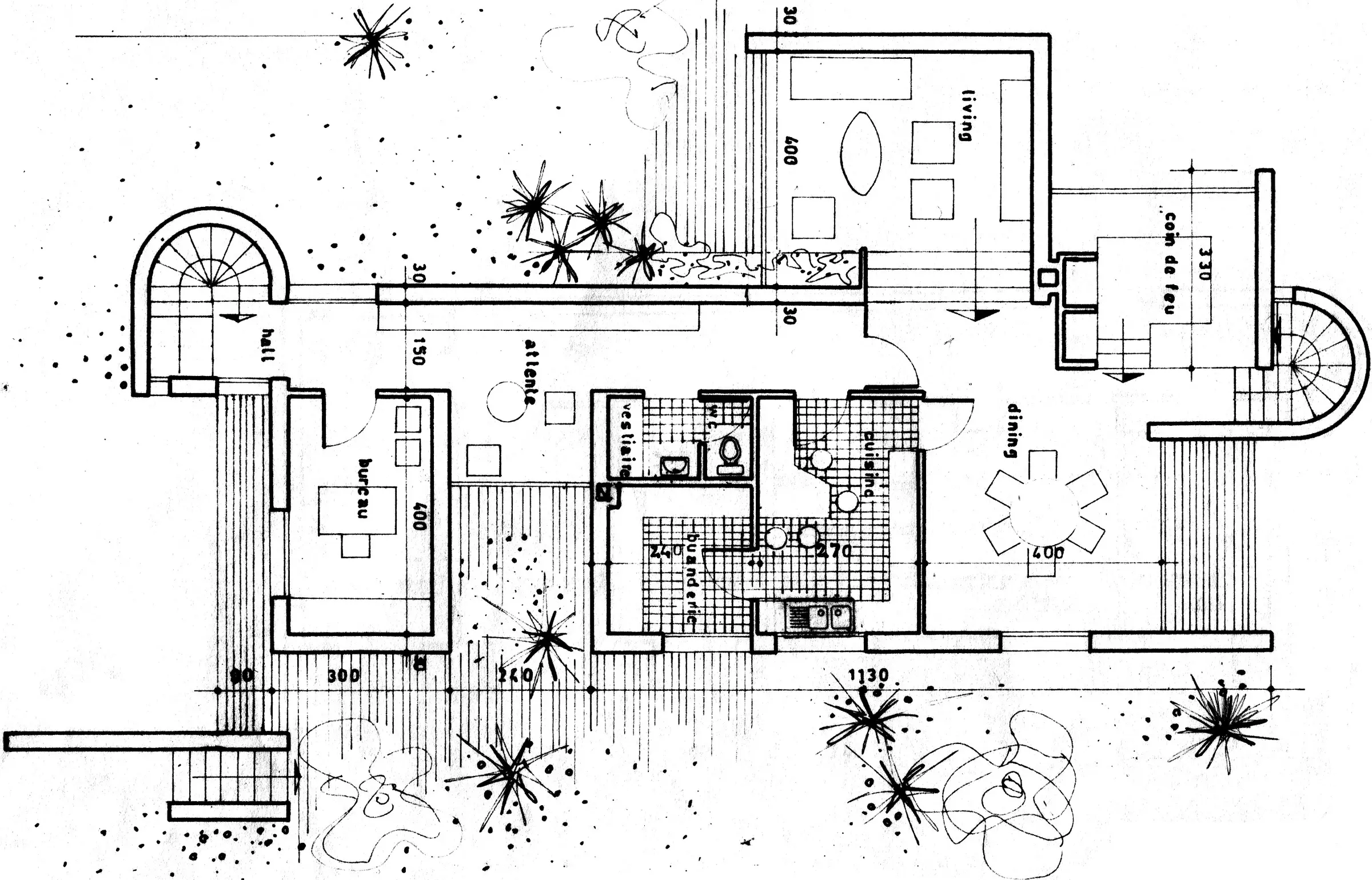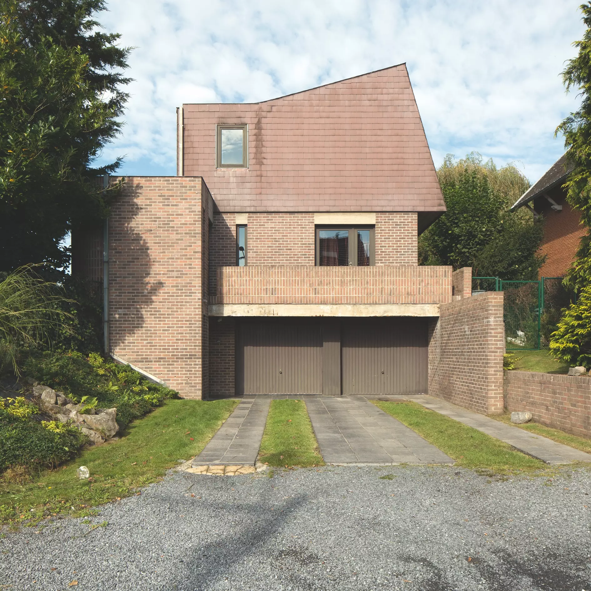 L'habitation, implantée perpendiculairement à la voirie, exploite la déclivité naturelle montante du terrain afin de profiter d'un accès direct au jardin. La conception est basée sur le jeu de deux escaliers : l'un permet l'accès, depuis la rue, à la zone de vie et l'autre mène de cette dernière aux pièces de nuit.