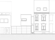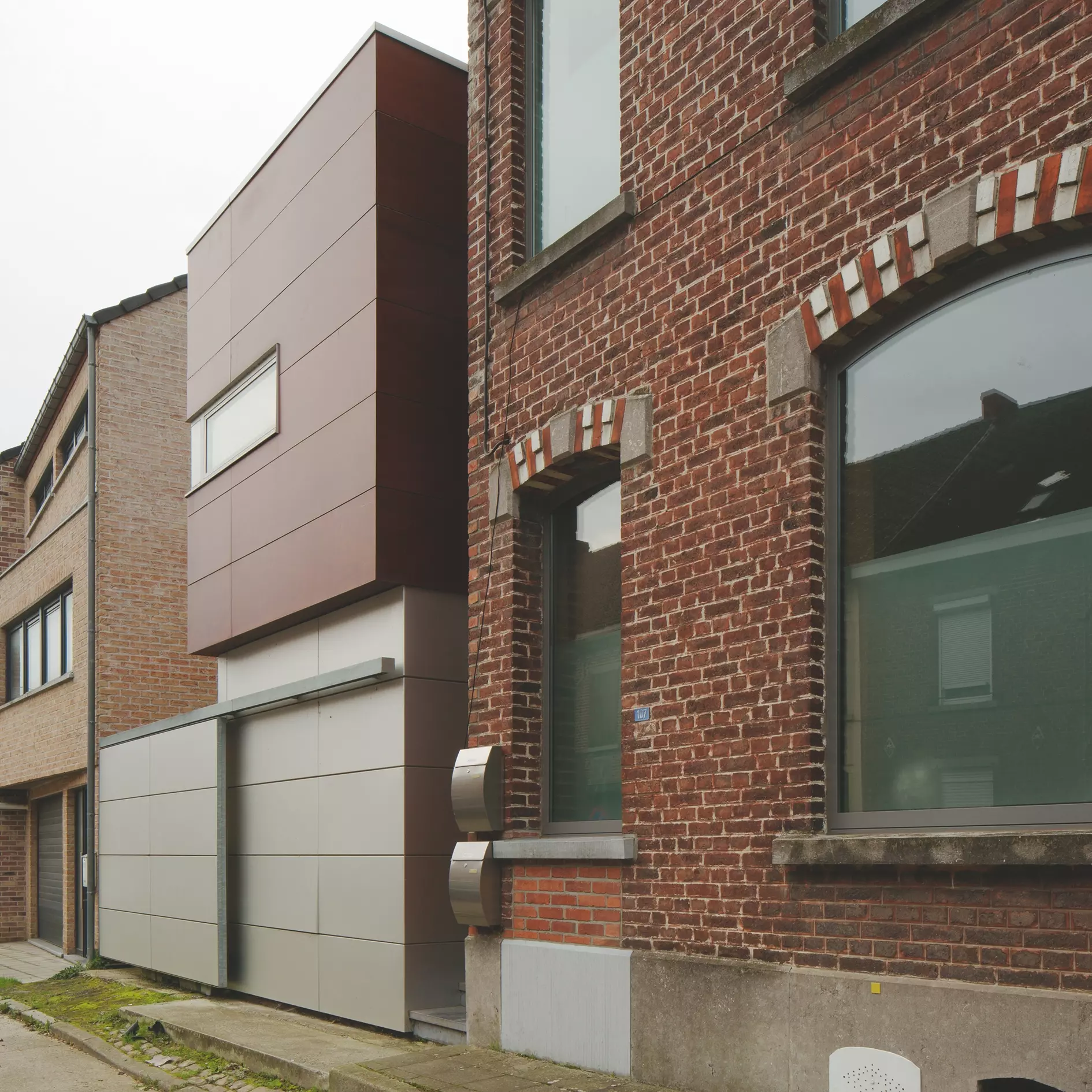 Par respect des gabarits voisins et en limite de propriété, l'extension génère un ordre continu dans la rangée alignée de maisons existantes, en n'occupant que la moitié de la parcelle. Le portail d'accès à l'emplacement de stationnement est camouflé par un traitement homogène en aluminium anodisé sur l'ensemble du rez-de-chaussée.