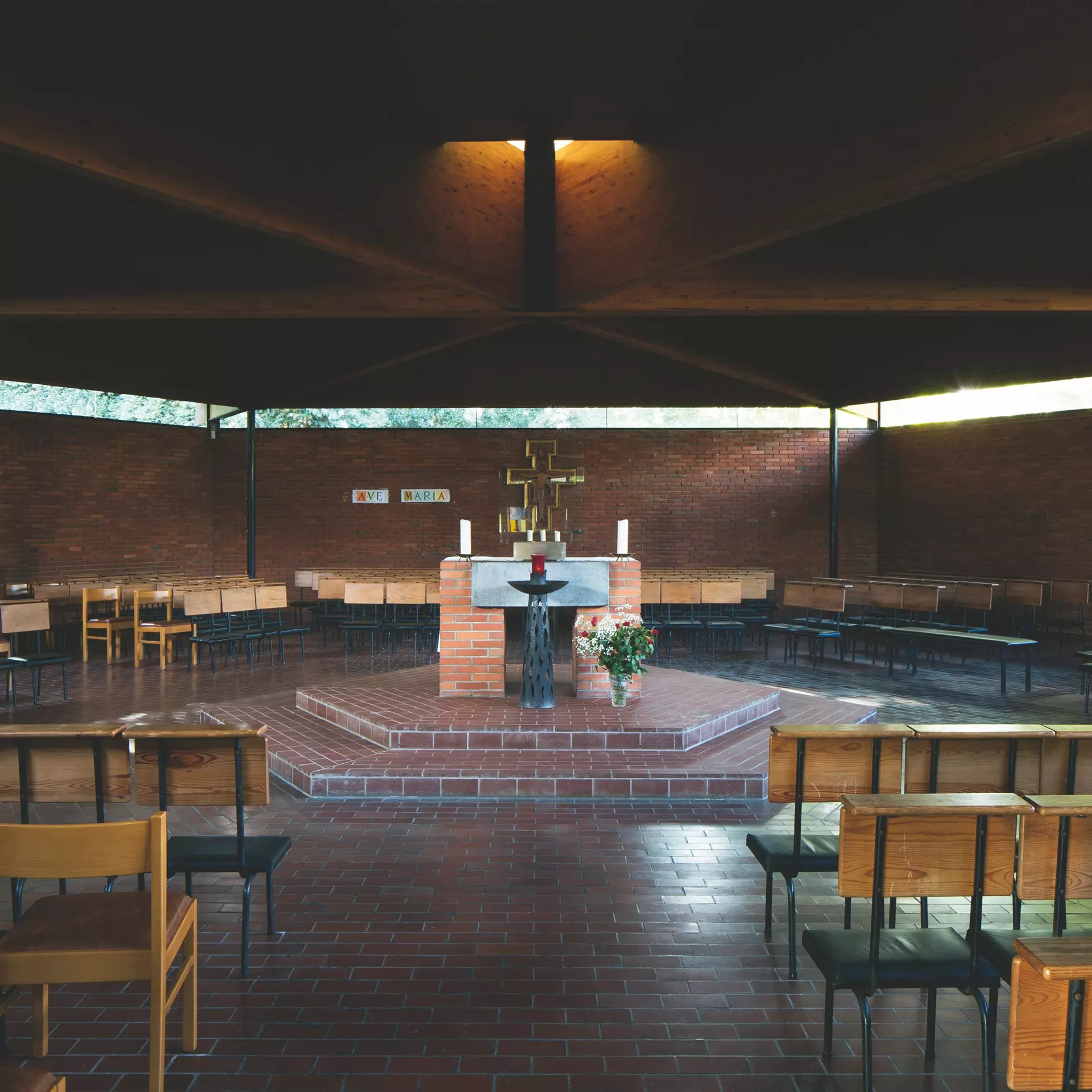 À l'intérieur comme à l'extérieur, l'emploi unique de briques rouges confère une remarquable sobriété à l'édifice, soulignée par la dominante verte du jardin dessiné et entretenu soigneusement. Sous un toit plat débordant par endroits, un long bandeau vitré épouse les contours du promontoire sur lequel est placé l'autel. Son inscription en plein centre de la pièce souligne la symbolique communautaire du rituel religieux.