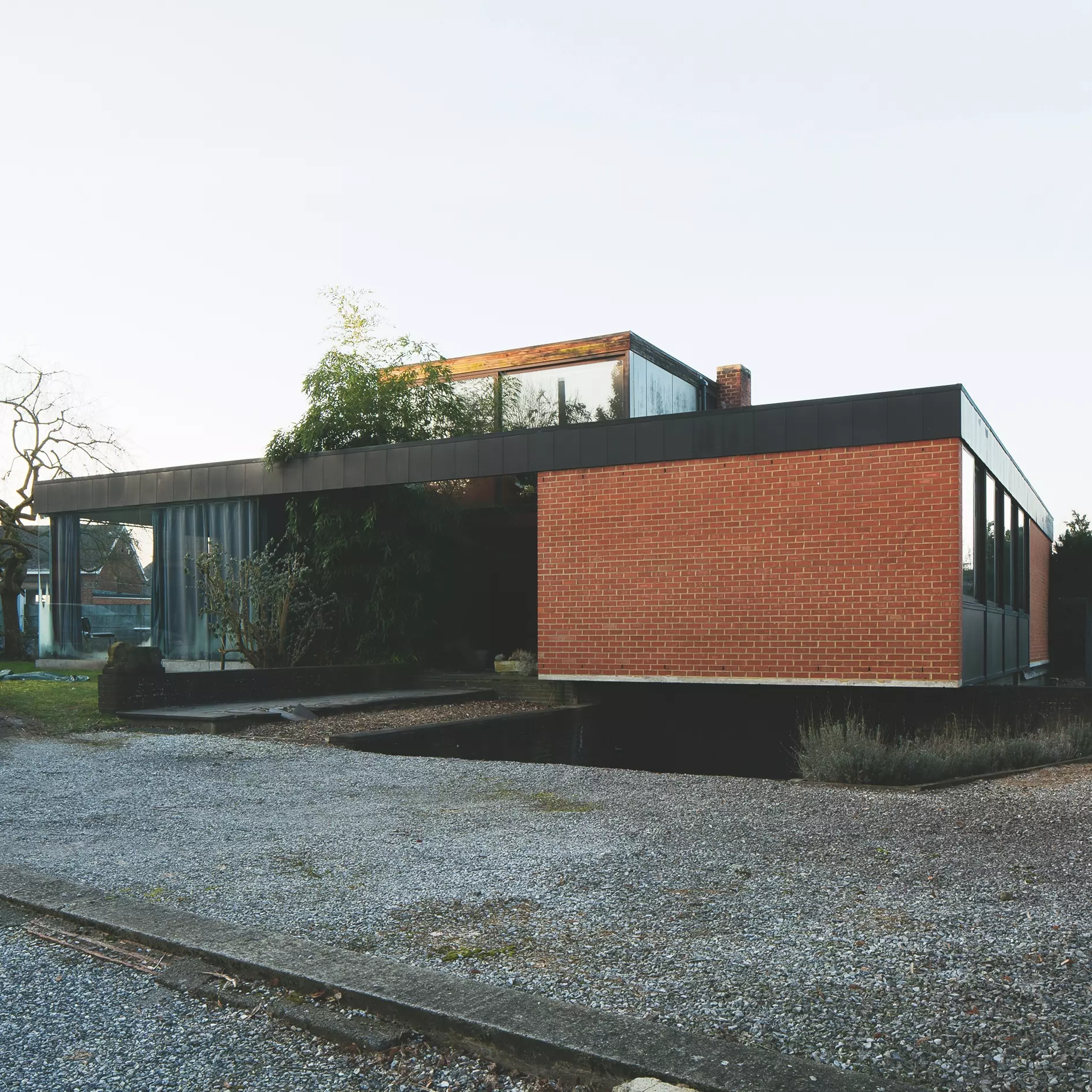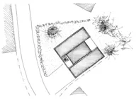 Implantée au centre d'une parcelle triangulaire, cette maison d'architecte présente un plan en H, avec trois travées de même largeur, inscrites dans un carré parfait. La symétrie s'exprime également en élévation : l'entrée est traitée dans l'axe du projet, le gabarit des travées latérales est identique (sur un niveau), les terrasses créées par le retrait du volume central (sur deux niveaux) sont les mêmes, côtés rue et jardin.