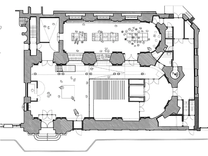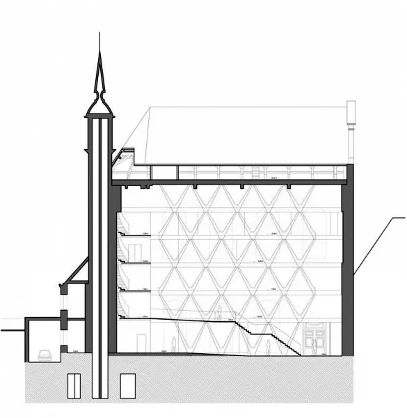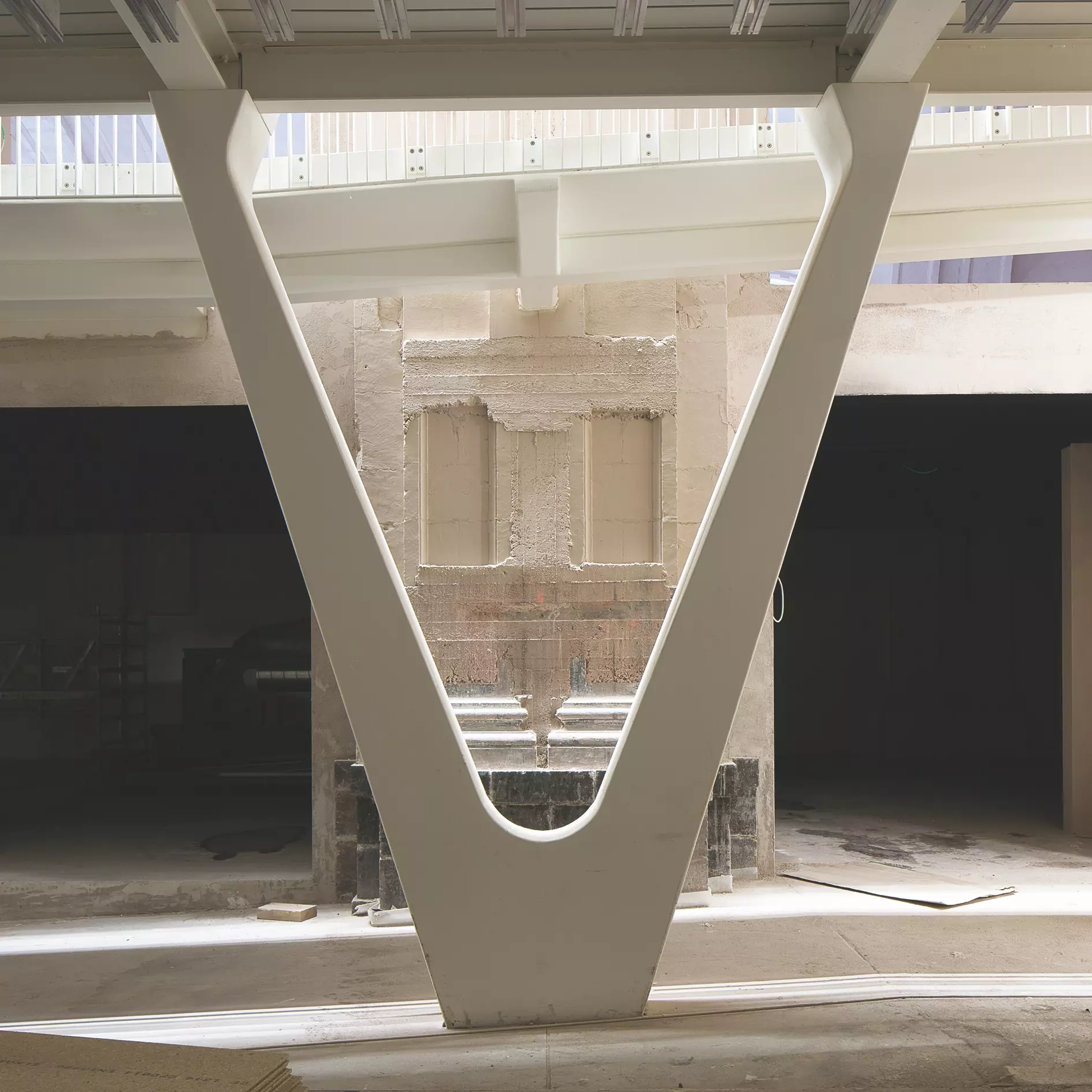 Dans la faille, une résille métallique soutient tous les plateaux. Elle s'insère dans le rythme de l'architecture ancienne tout en créant un contraste : son dessin léger s'oppose à la massivité de l'ancien. Au premier étage de la nef latérale, le centre de documentation, ample espace dont l'ancien décor est conservé, constitue un espace public plus réservé, dédié aux chercheurs.