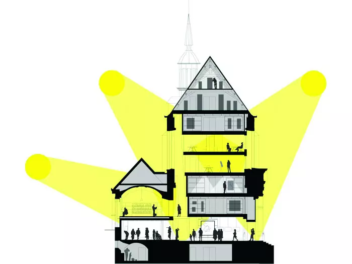 Dès l'accueil, la lumière qui provient de la faille invite le visiteur à découvrir la présence de la nef latérale. Cette faille en dit autant sur l'édifice ancien que sur la fonction nouvelle, révélant l'espace originel ainsi que la succession des étages fermés, contenant les milliers d'objets, dont quelques échantillons sont présentés au rez-de-chaussée.