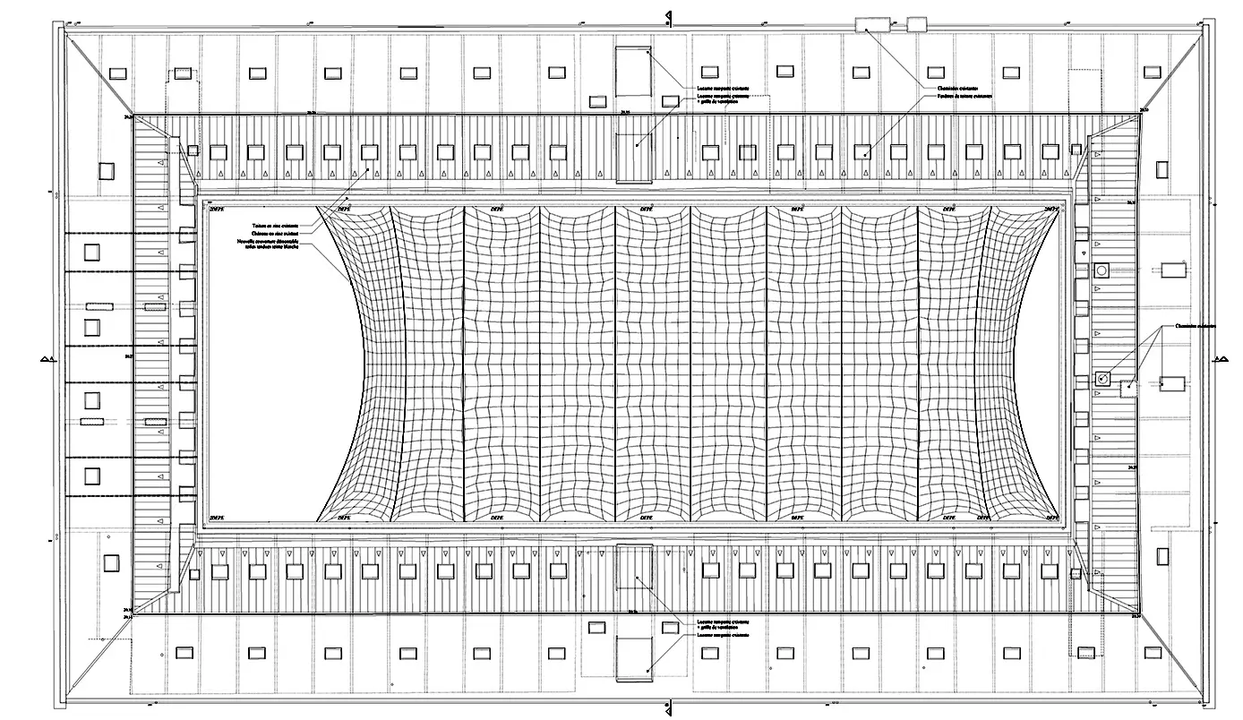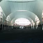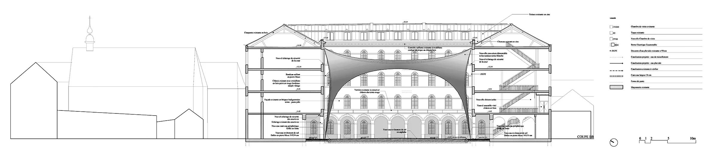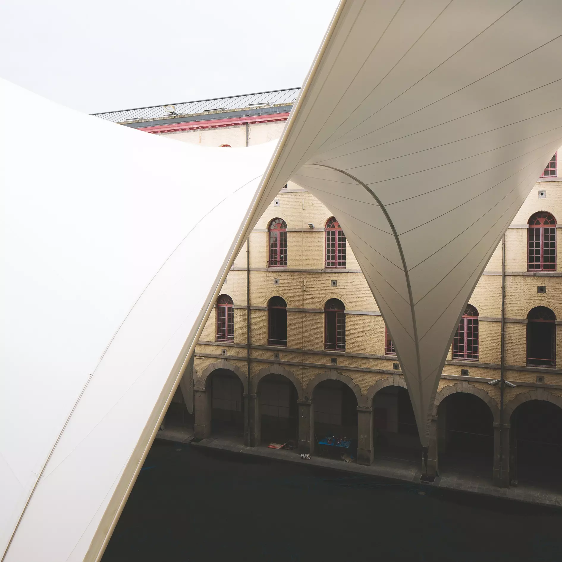 Cinq toiles monumentales translucides, à la conception proche de l'architecture navale, couvrent presque totalement (80 %) la cour – investie à cette occasion par une composition du plasticien Jean-Luc Moerman – et protègent désormais les activités, tout en définissant un cadre spatial proche des intentions originelles (mettre jusqu'à 1 200 personnes à l'abri dans des conditions optimales de production artistique).