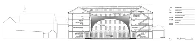 Les façades étant classées, les interventions du nouvel équipement sont réduites aux ancrages, en discrétion, maintenus par des micropieux placés sous les corniches.