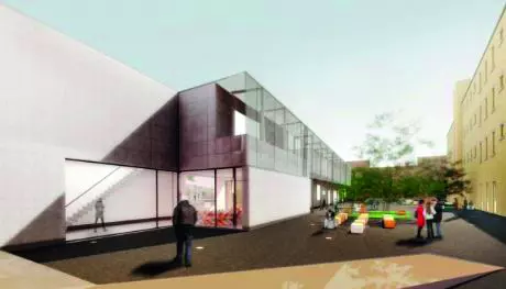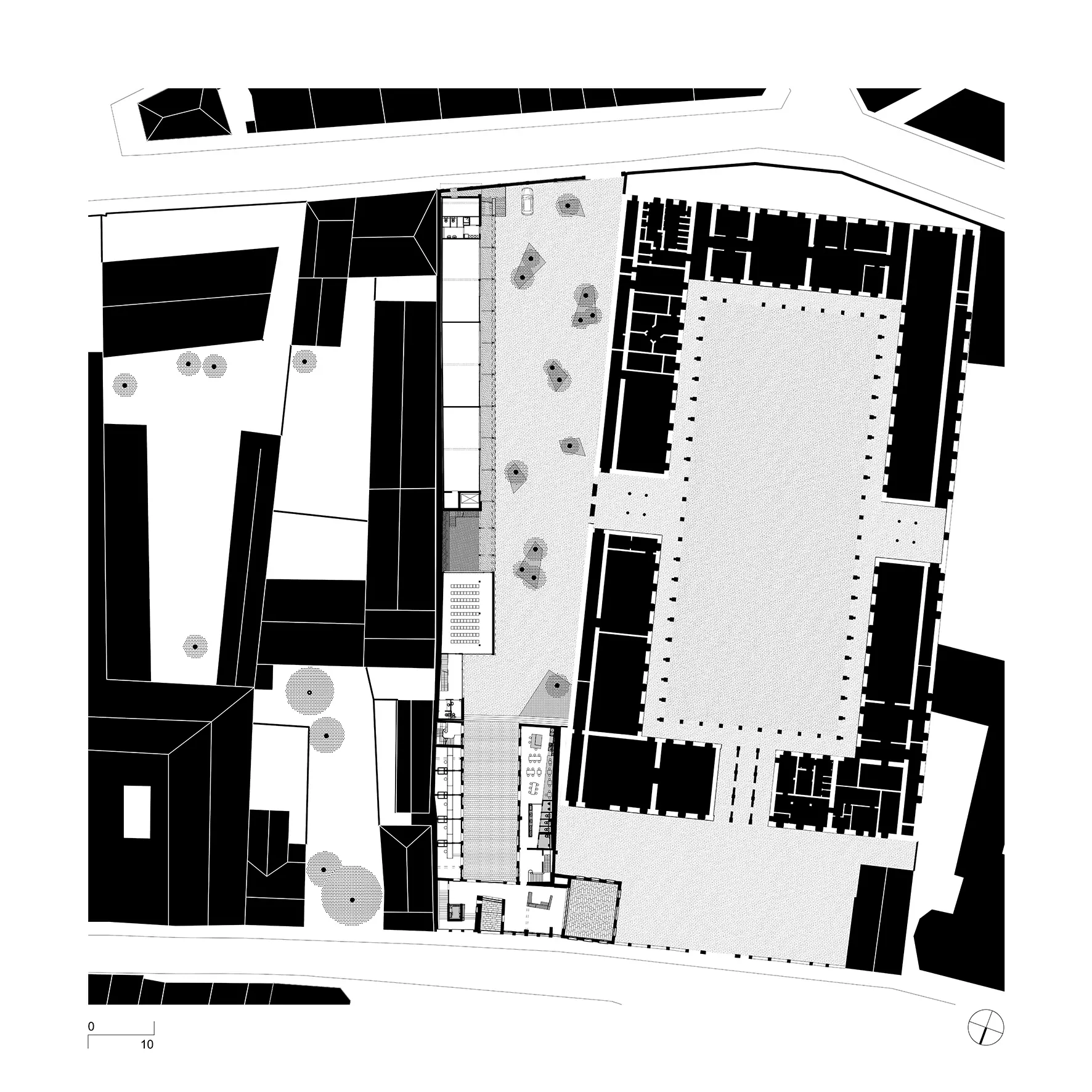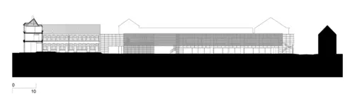 Imaginé comme une citadelle ouverte sur la ville, le site se traverse en profitant des espaces publics situés aux extrémités. Un parc arboré, également développé en longueur, complète l'intervention. L'extension se présente en deux parties d'épaisseurs différentes pour s'aligner au volume existant, mais aussi en deux entités séparées par un patio planté de fleurs, et reliées par une coursive distributive qui assure l'unité de la composition bipartite. Ses revêtements sont métalliques, de ton blanc cassé ou gris clair, en harmonie chromatique avec le badigeon qui est appliqué sur les maçonneries de la partie XVIIIe.