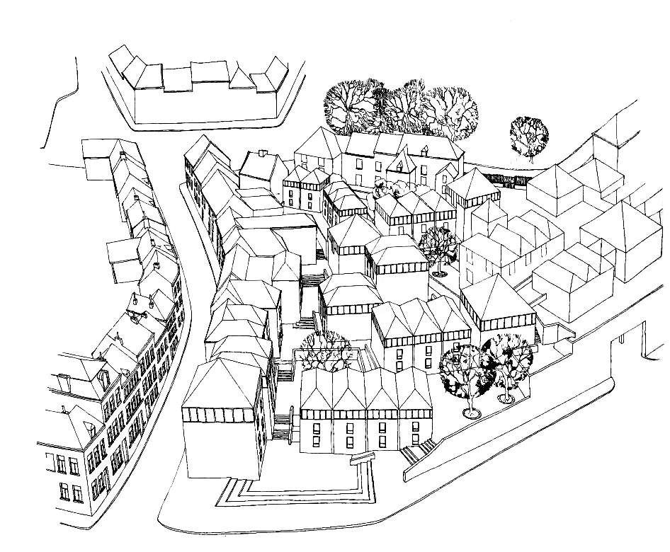 Le projet conserve les ensembles bâtis du XVIIIe siècle les plus intéressants et les lie par la construction de nouveaux immeubles dont l'échelle, les volumes, les teintes et les rythmes s'apparentent au caractère des façades conservées. Ce choix a déterminé une gamme limitée de matériaux à mettre en œuvre (briques rouges rugueuses, pierre bleue et ardoises) afin de conserver à la rue sa relative homogénéité visuelle.