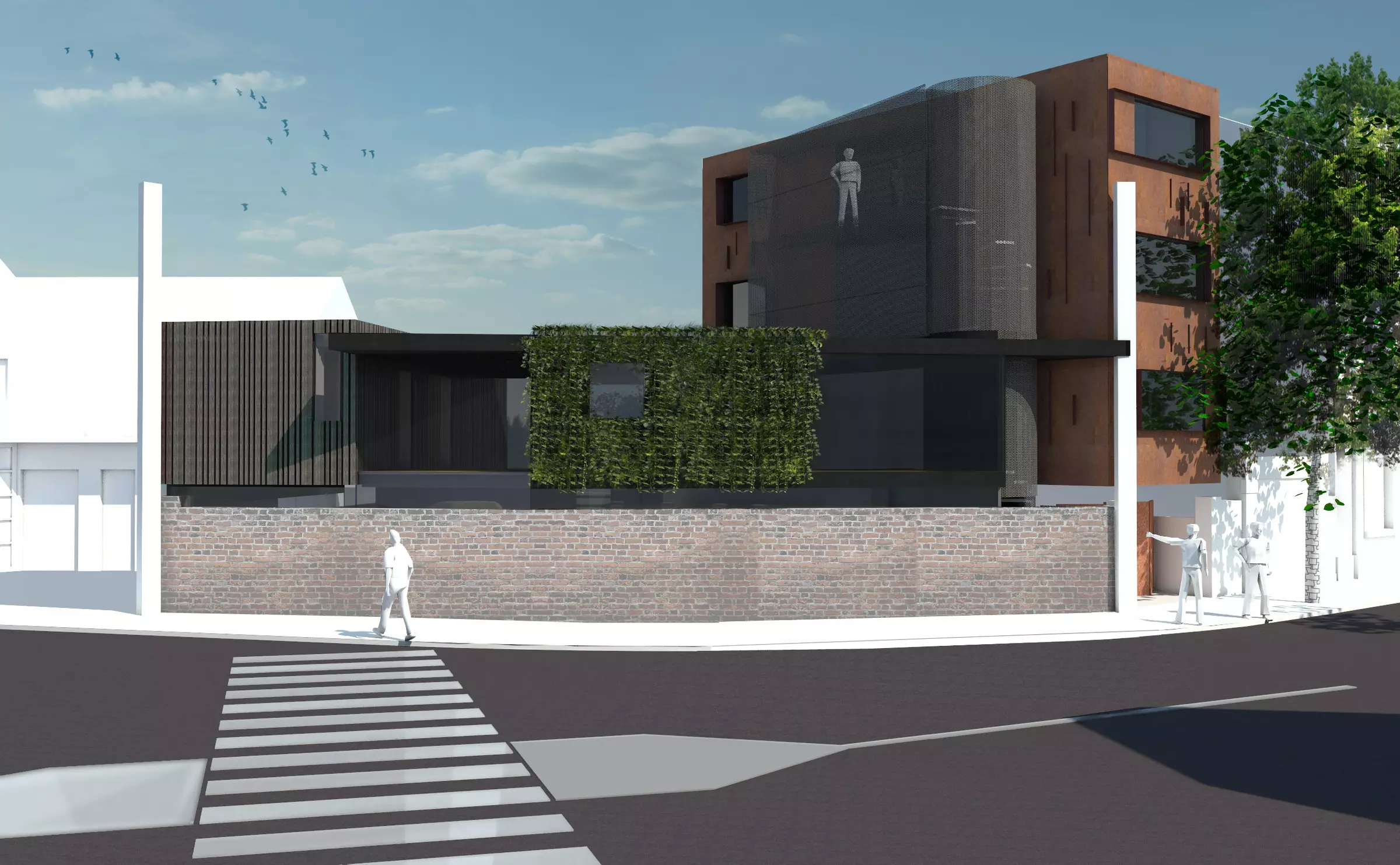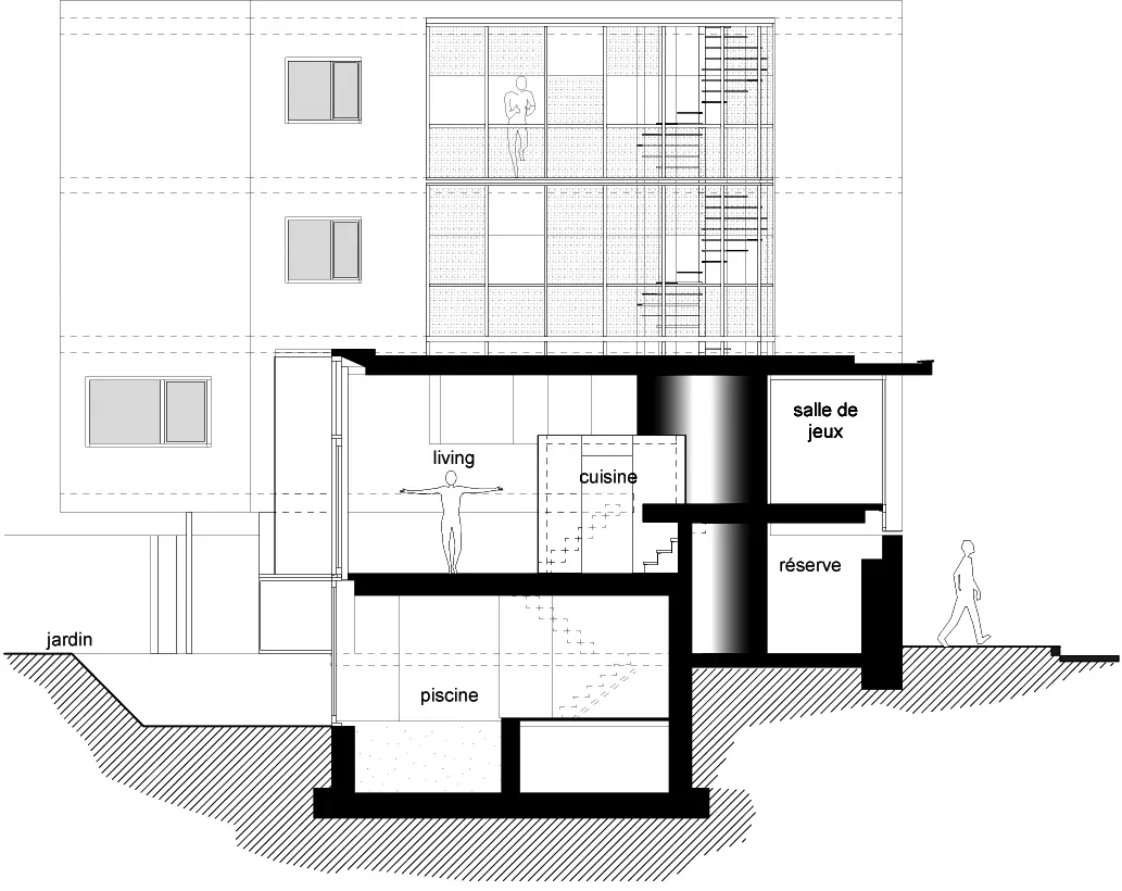 Au carrefour de la chaussée du Rœulx, la construction joue audacieusement de la parcelle de forme triangulaire. Le mur de clôture en briques est volontairement préservé pour protéger l'habitation de la circulation automobile. Surplombant celui-ci, deux volumes distincts se raccrochent aux gabarits des mitoyens. Le plus haut abrite quatre kots accessibles par un escalier en colimaçon dissimulé derrière une paroi métallique. Le plus bas accueille les chambres de l'habitation unifamiliale, tandis qu'à l'articulation du projet, la partie centrale est occupée par les pièces de vie, disposées en demi-niveau, surélevées par rapport à l'espace public.