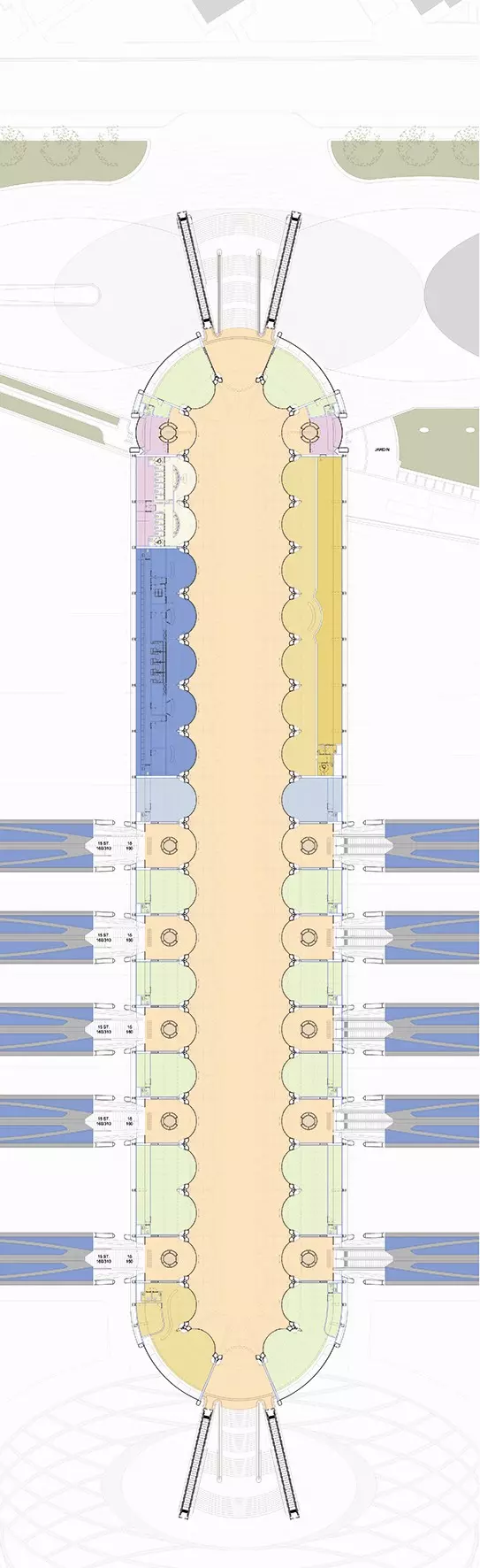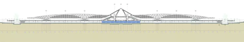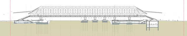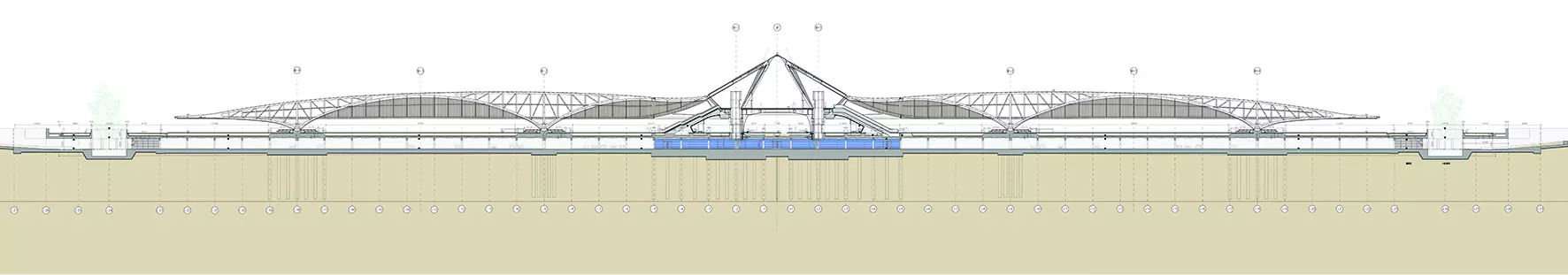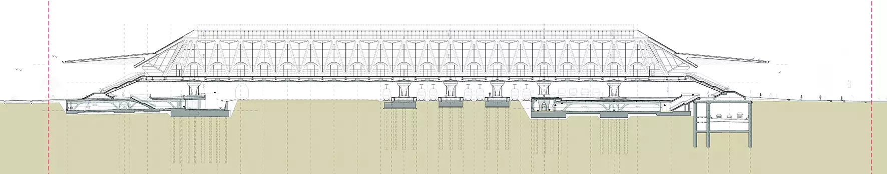 La structure principale est composée d'arcs prenant appui sur la gare-passerelle et sur deux fondations ponctuelles par demi-quai. Sur chaque quai, les salles d'attente sont appuyées au dos des escaliers et des escalators menant à la gare-passerelle. L'ancrage des façades accentue son inscription dans le tissu urbain.