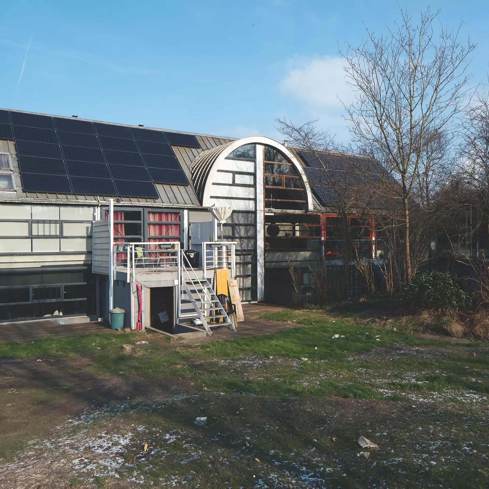 La situation semi-enterrée du rez-de-chaussée atténue la limite entre le jardin et les espaces de vie qui se trouvent à l'étage. Ces derniers sont entièrement ouverts, délimités seulement par les mitoyens, la façade arrière et la baie vitrée. Leur accès se fait par une porte qui donne directement vers l'extérieur, puis une courte série de marches encadrées par deux volumes de maçonnerie. Ces derniers prolongent les murs du rez-de-chaussée pour devenir, à l'étage, de massifs garde-corps. La monumentalisation symétrique de l'entrée, tout comme les autres éléments de composition du projet, ne sous-entend pas pour autant que le dessin de l'architecte y est autoritaire. Elle illustre plutôt la manière dont, dans cet habitat groupé autogéré, les règles classiques de composition évitent de contraindre l'usage du lieu. De fait, elles établissent les lignes esthétiques d'un espace neutre à investir avec liberté.