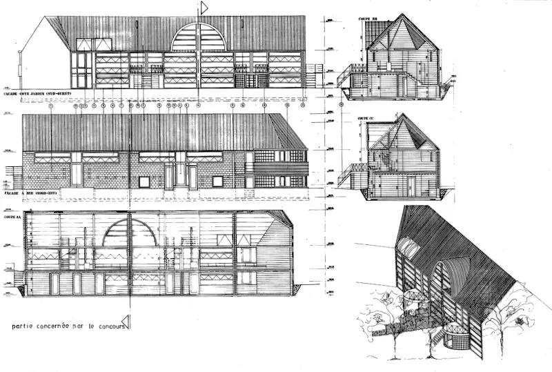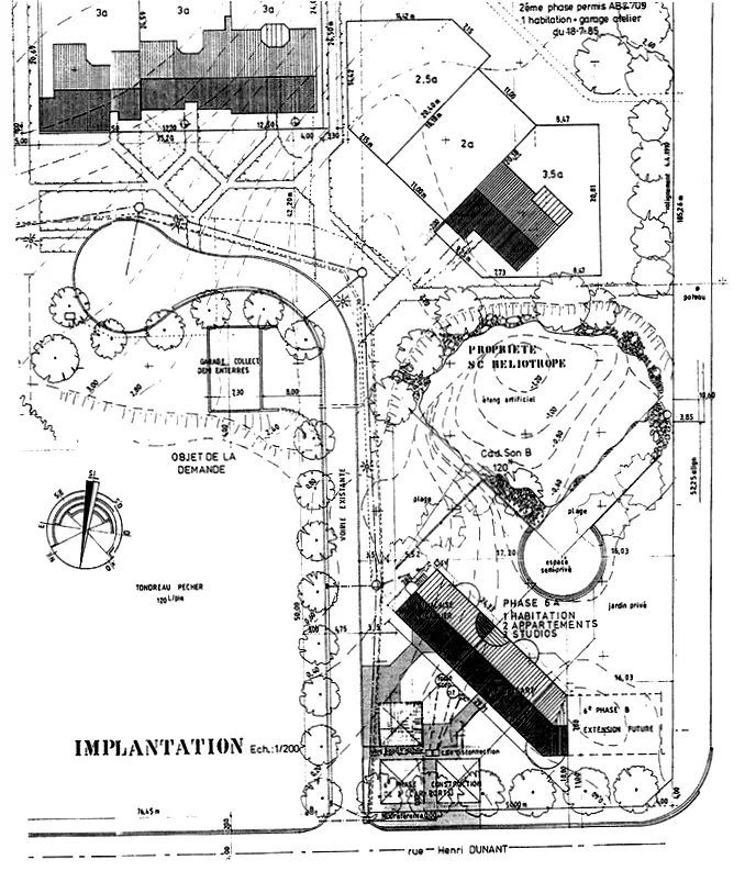 Formant un corps uni, le projet regroupe trois studios, deux appartements et une maison unifamiliale qui cohabitent dans un même volume. La villa devient ici mitoyenne, le regroupement des logements dans cette configuration dense permet à la parcelle de développer un généreux espace vert accessible aux habitants.