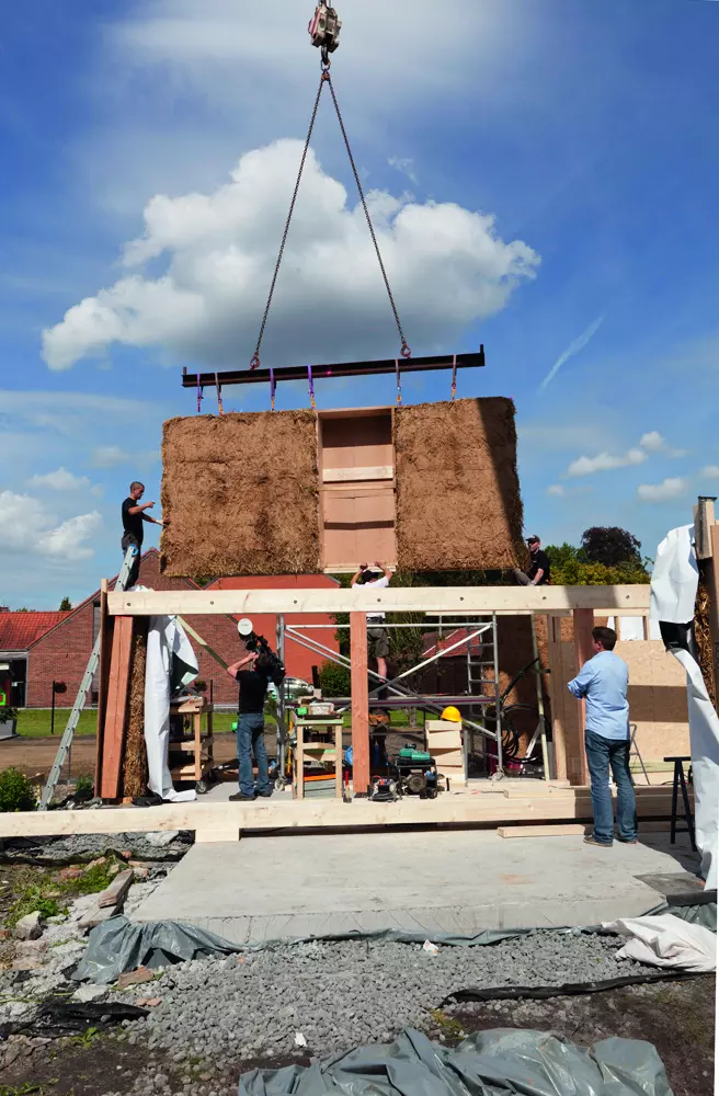 Le procédé constructif, mêlant matériaux naturels (paille, terre, bois), reflète le choix idéologique des propriétaires d'impacter le moins possible l'environnement. Conçue et construite en quatre jours par la société Paille-Tech, elle est considérée comme la première maison préfabriquée en paille de Wallonie. Des panneaux solaires, une citerne de récolte des eaux pluviales et des toilettes sèches complètent le parti pris.