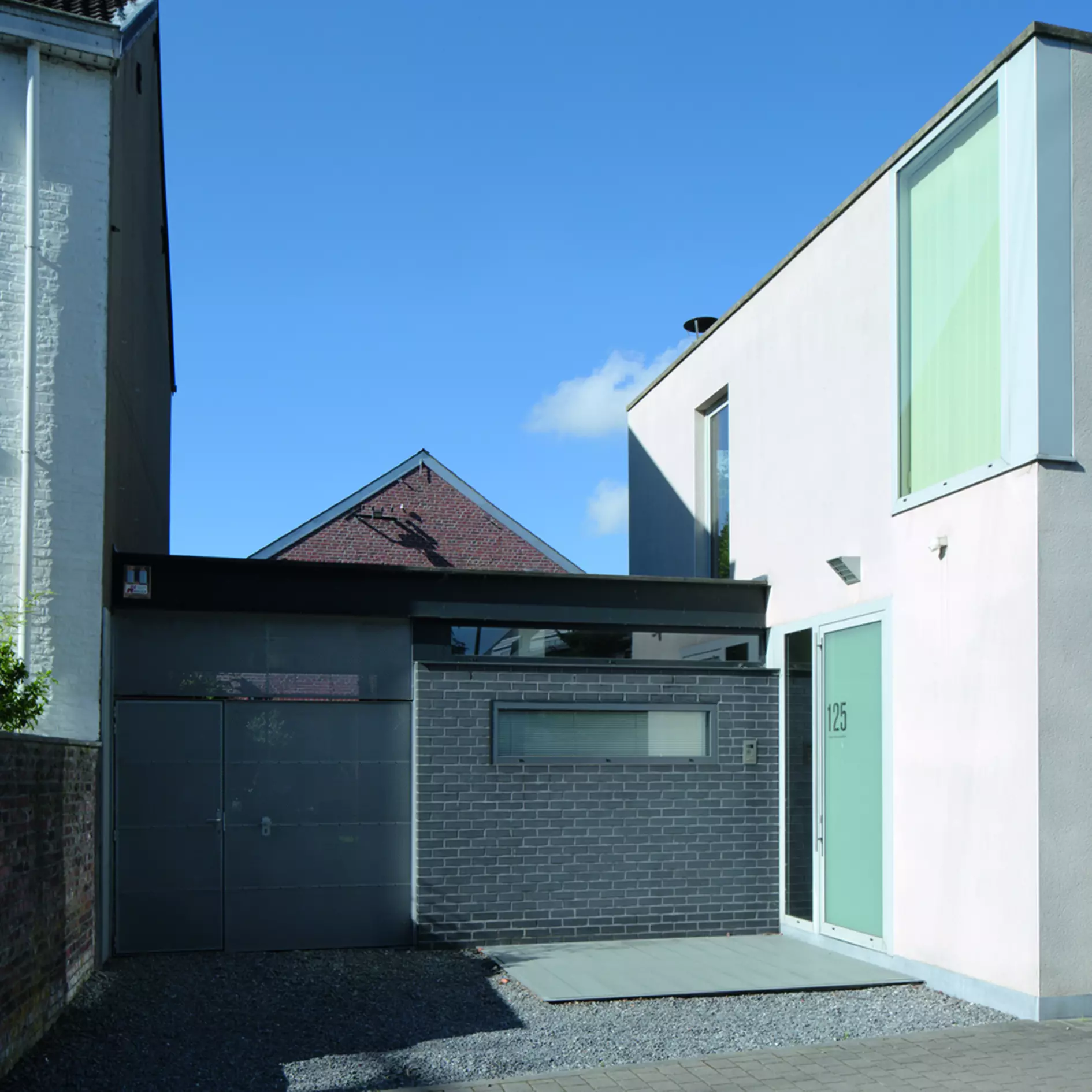 Le mitoyen de la maison ouvrière est une grande masse aveugle. Pour conserver la force de sa présence dans la composition, elle est touchée discrètement avec des éléments légers du nouveau projet : la toiture et le grillage blanc du carport. La transparence de cet espace contraste avec les façades enduites et sculptées par les ouvertures.