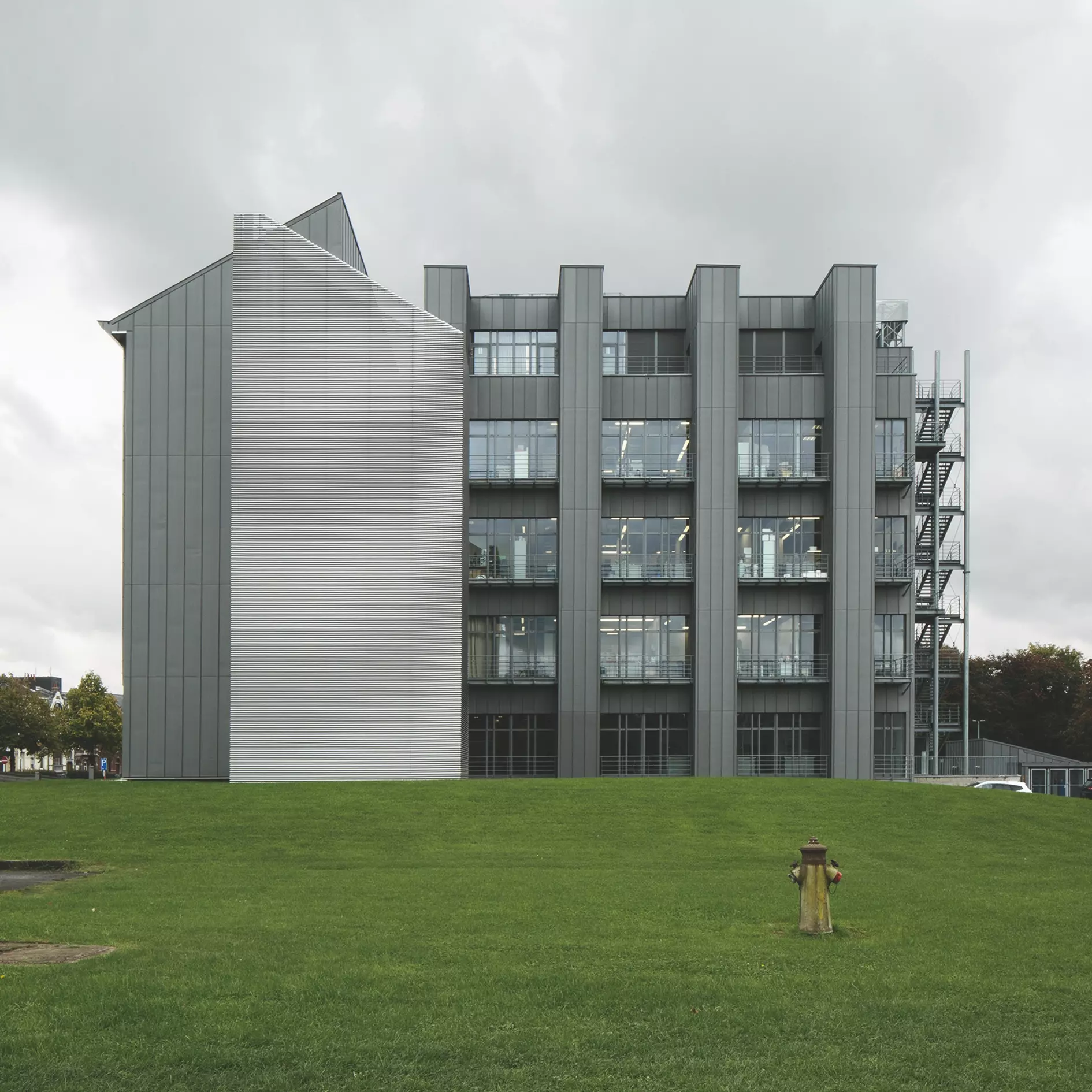 À l'arrière, pour l'aile spécialisée, les deux façades latérales de caractère technologique s'expriment dans la verticalité des gaines des divers impétrants. La composition traduit un brutalisme de contraste qui fait appel à des mises en œuvre de matériaux variés comme l'acier laqué pour les châssis des baies vitrées, les panneaux en terre cuite des allèges, les bardages et toiture de zinc à joints debout et le métal déployé pour les escaliers de secours.
